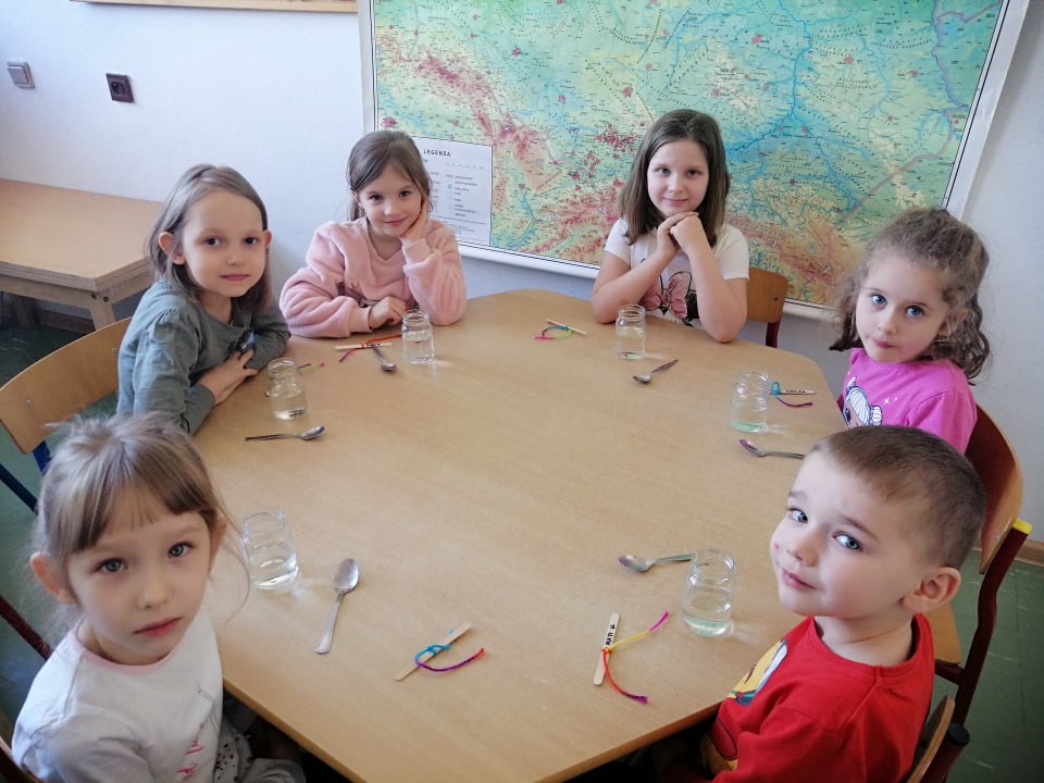 Kolejnym doświadczeniem, które mieliśmy okazję wykonać była hodowla kryształków. Doświadczenie to pokazuje, że sól z nasyconego roztworu ciepłej wody, na skutek parowania, osadza się na ściankach naczynia, w którym znajduje się ciecz oraz na umieszczonej w niej nitce. Na efekty trzeba było trochę poczekać, ale nasi badacze stwierdzili, że było warto