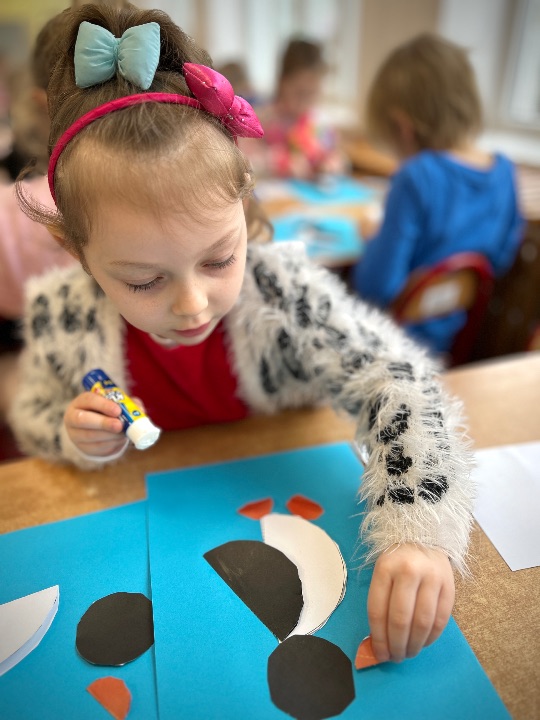Podczas zajęć plastycznych przedszkolaki wykonały pracę pt. „Pingwin królewski” techniką - origami kołowe. Dzieci z wielkim zaangażowaniem wycinały kółeczka, składały je na połowę tworząc sylwetkę pingwina. Ćwiczyły przy tym sprawność manualną, precyzję ruchów oraz cierpliwość. Praca wymagała skupienia i dokładności, a efekty były wspaniałe! Każdy pingwin był wyjątkowy i niepowtarzalny – zupełnie jak jego autor 😊