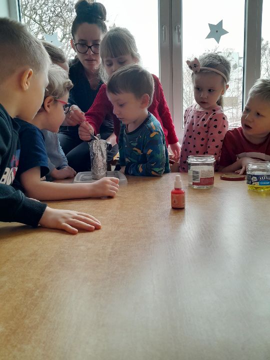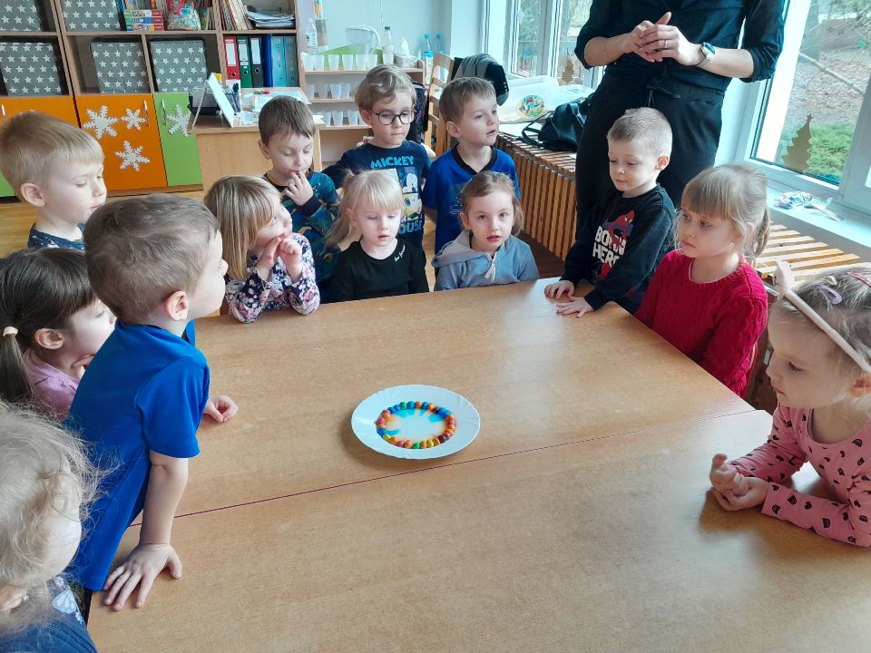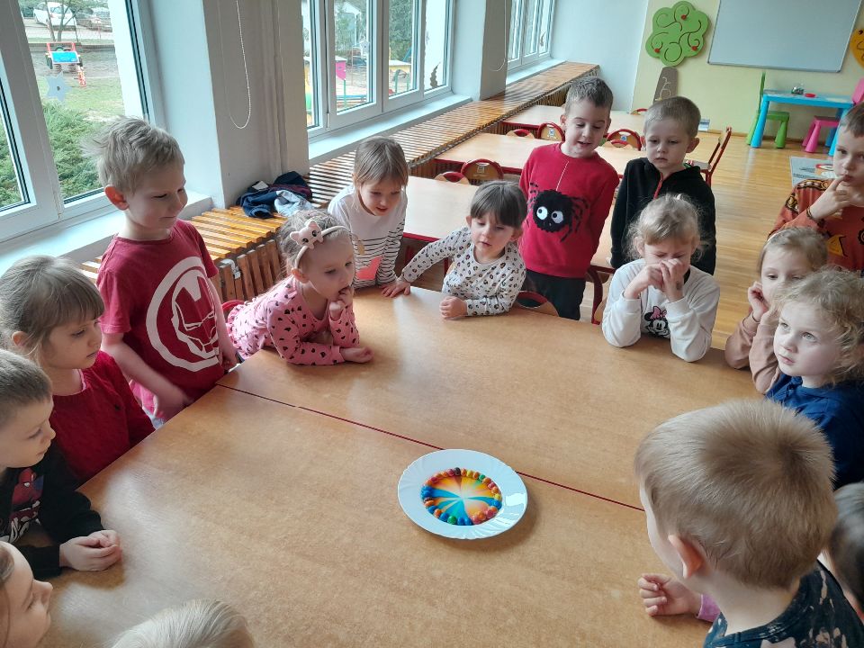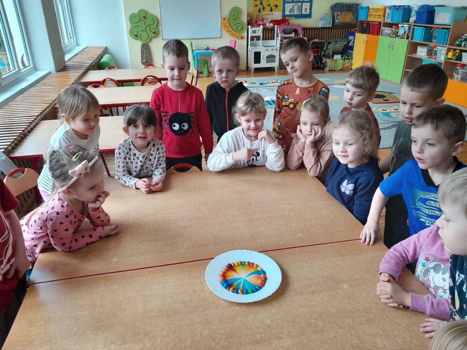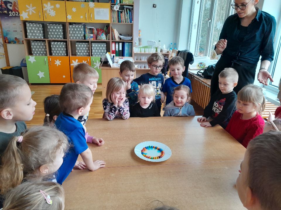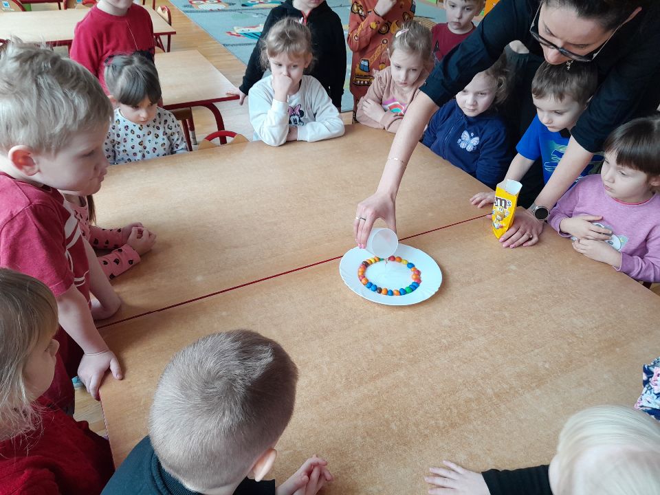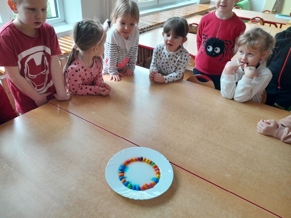 Tygodniową tematyką są doświadczenia, dlatego postanowiliśmy zrobić tęczę z cukierków oraz wulkan z sody oczyszczonej i octu. A oto efekty naszych działań...
