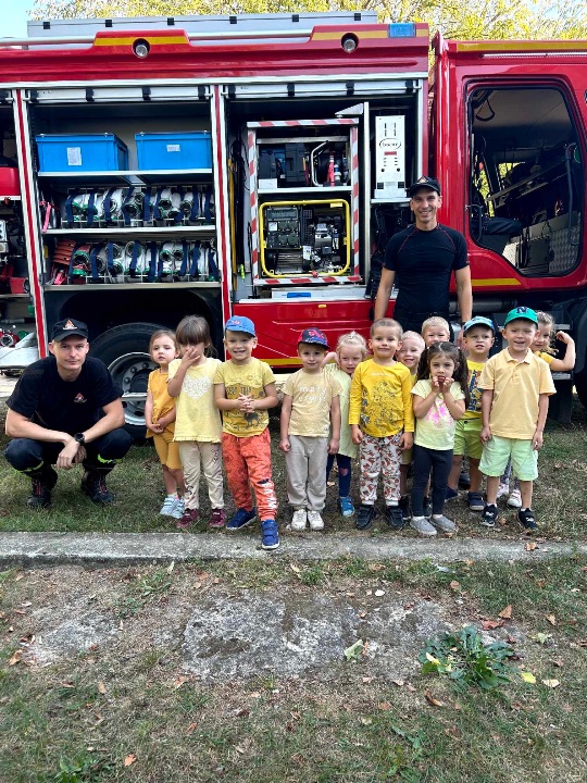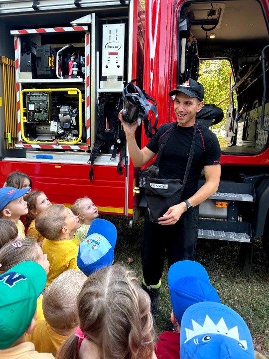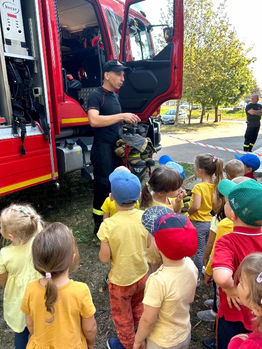 Wielką niespodzianką była też wizyta wyjątkowych gości, czyli strażaków z Państwowej Straży Pożarnej w Białymstoku, którzy przyjechali wielkim czerwonym wozem strażackim pod nasze przedszkole. Goście opowiedzieli nam o swojej codziennej, często niebezpiecznej, ale bardzo potrzebnej pracy.