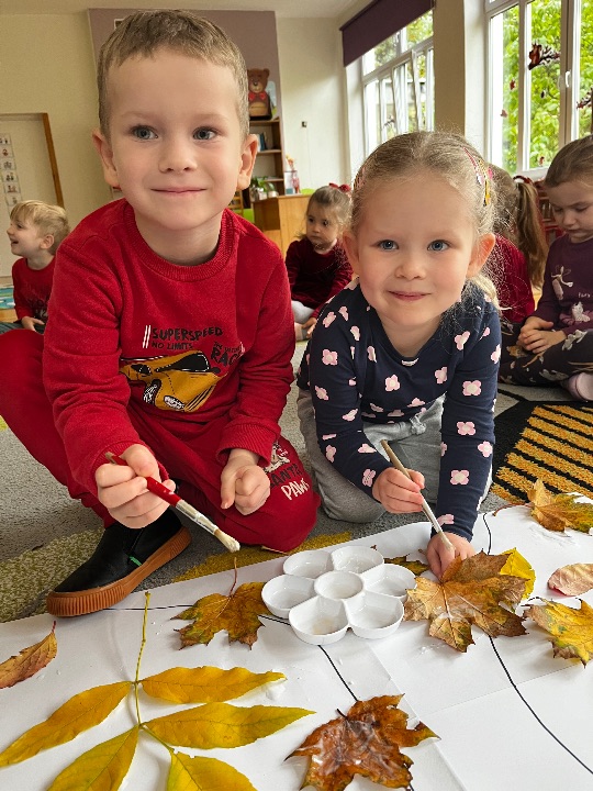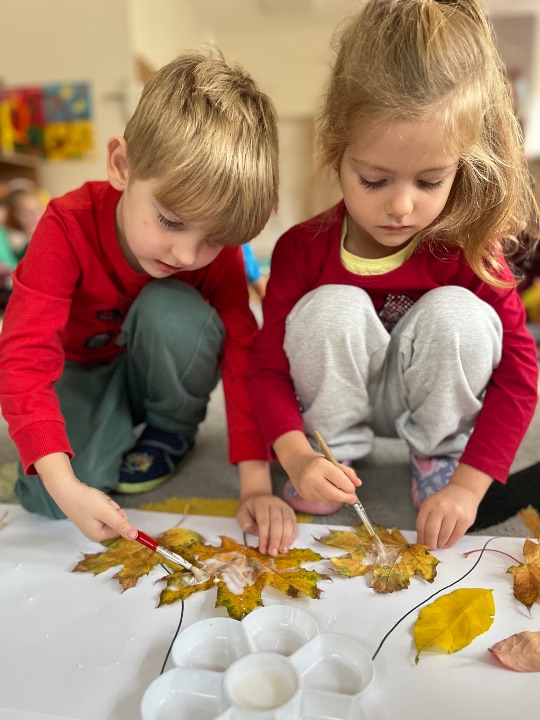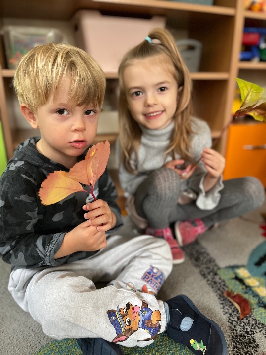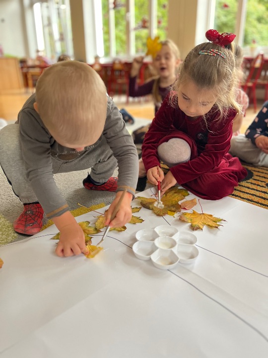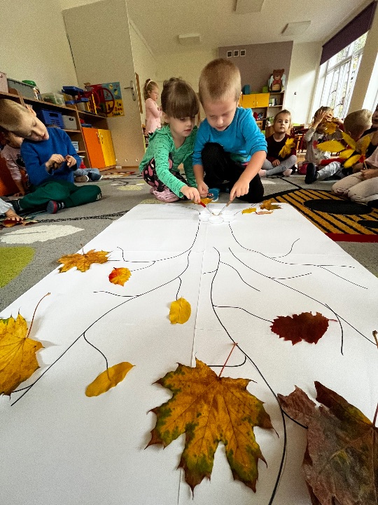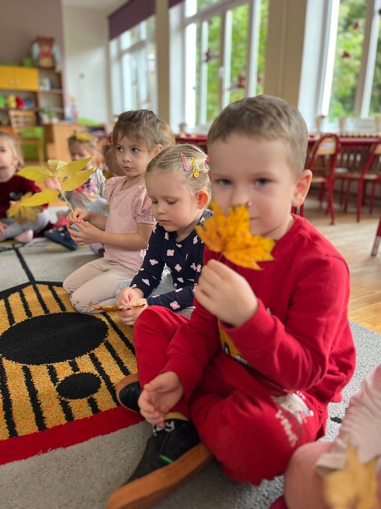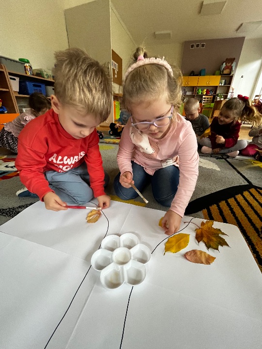 Jesień to świetna pora roku! Przyroda obdarowuje nas pomocami do zabawy. Dzieci z grupy II ćwiczyły orientację przestrzenną na płaszczyźnie, wykorzystując jesienne liście.