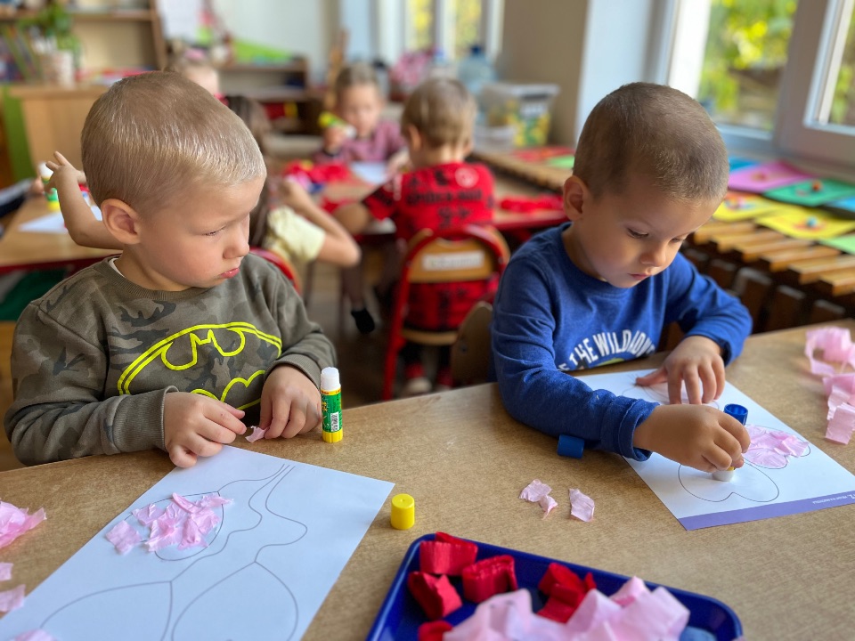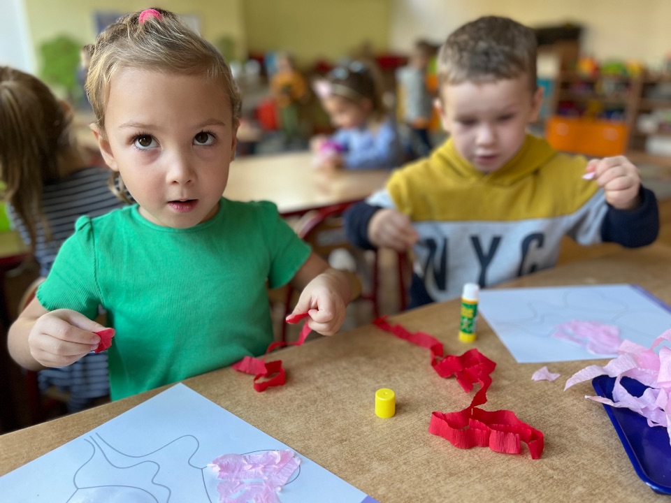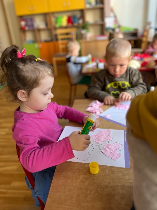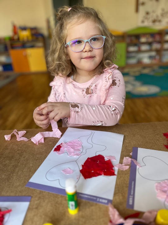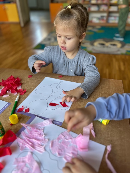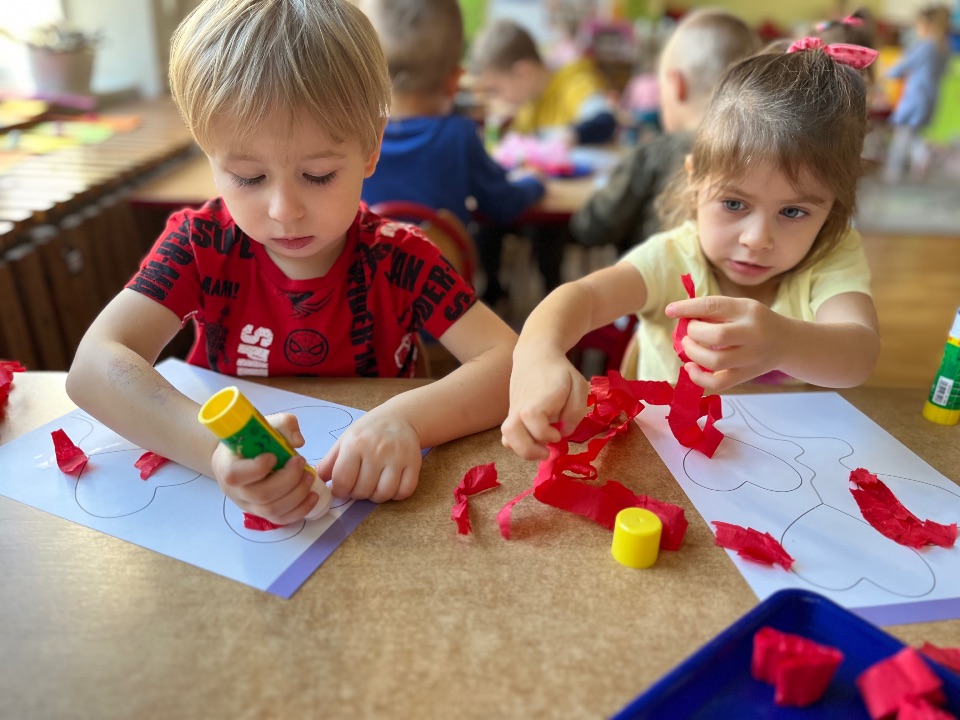 Jednym z dobrych ćwiczeń motoryki małej jest rwanie papieru. Dzieci świetnie poradziły sobie z wykonaniem pracy plastycznej. Rwały i wyklejały serduszkowe elementy.