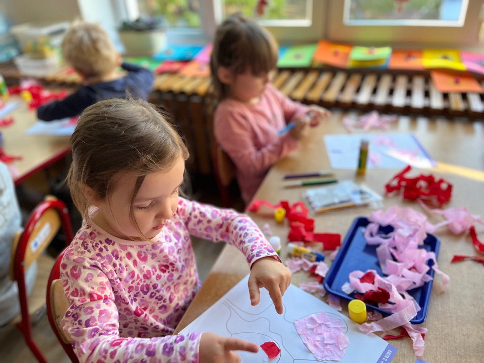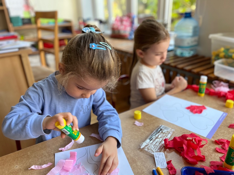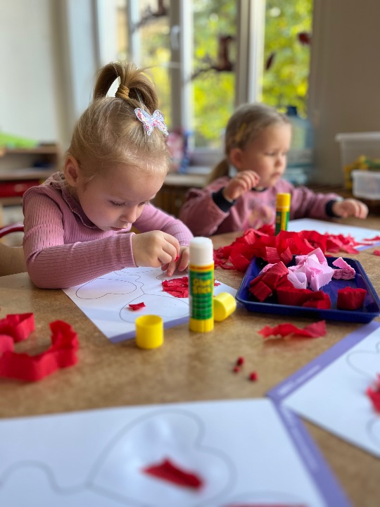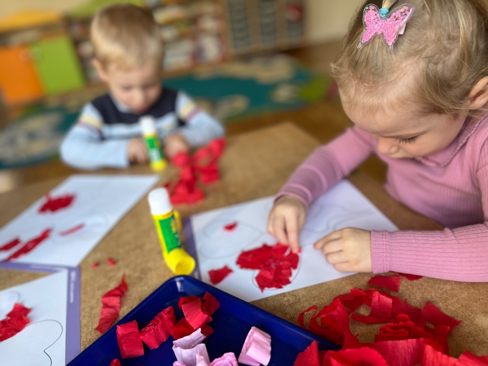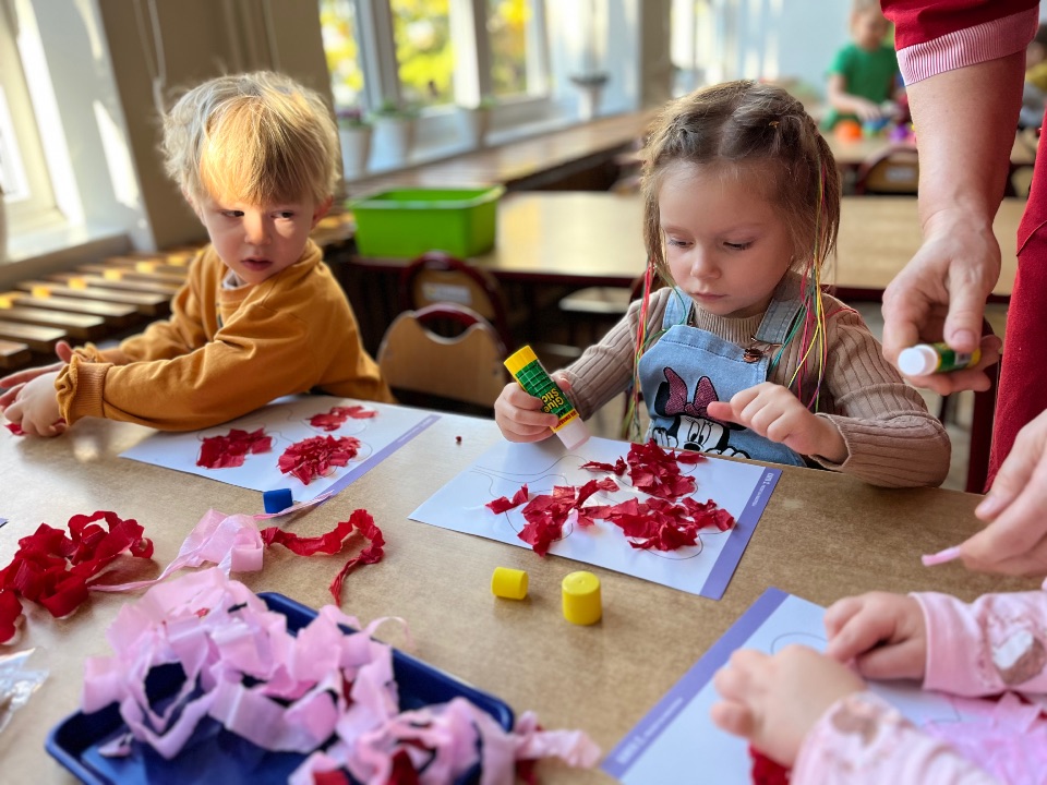 Jednym z dobrych ćwiczeń motoryki małej jest rwanie papieru. Dzieci świetnie poradziły sobie z wykonaniem pracy plastycznej. Rwały i wyklejały serduszkowe elementy.
