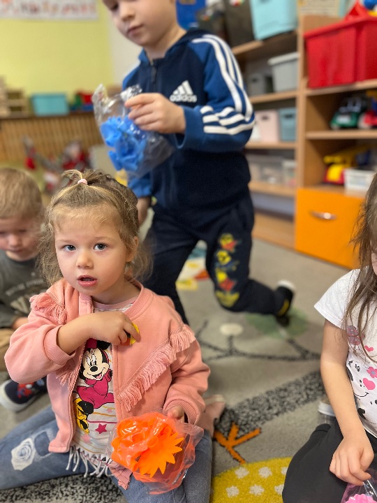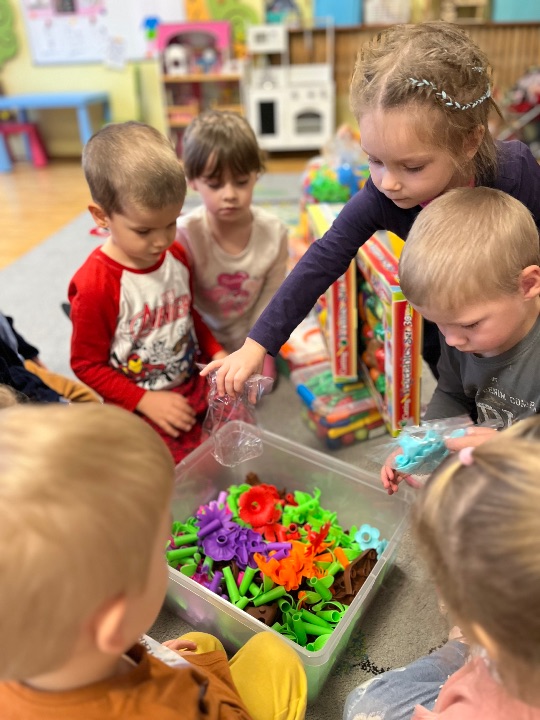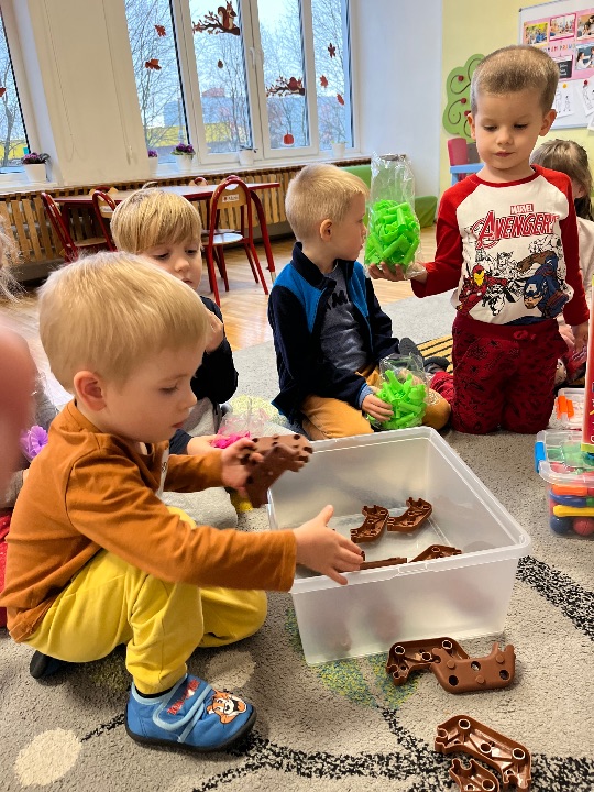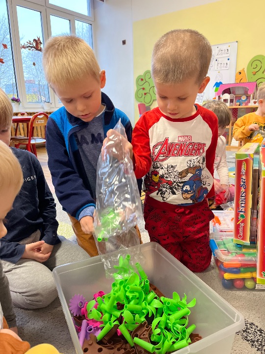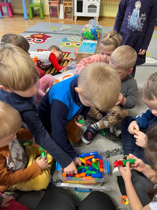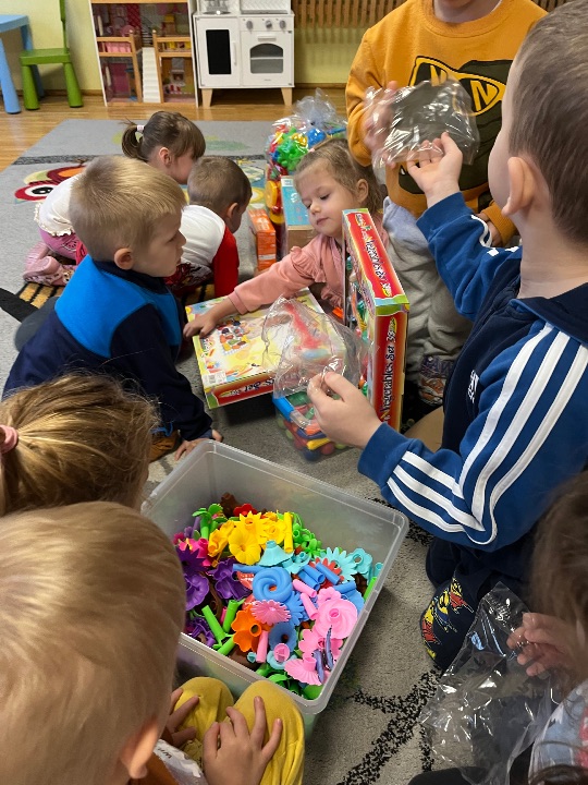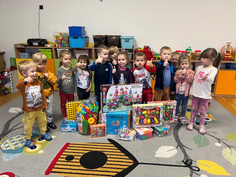 Hurra! Dzieci z grupy II pragną pochwalić się nowymi zabawkami, które zostały zakupione z funduszu zabawkowego.
