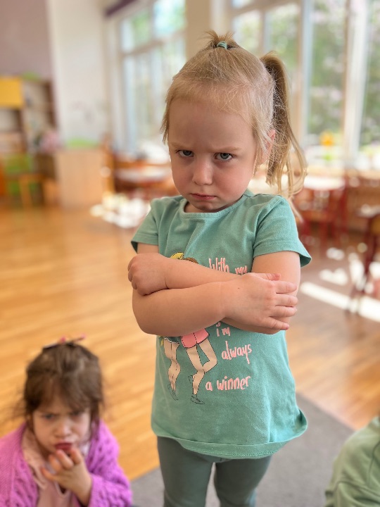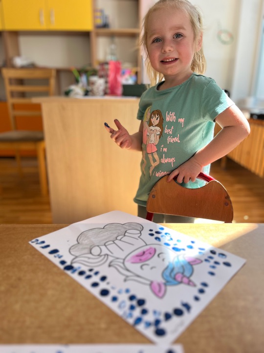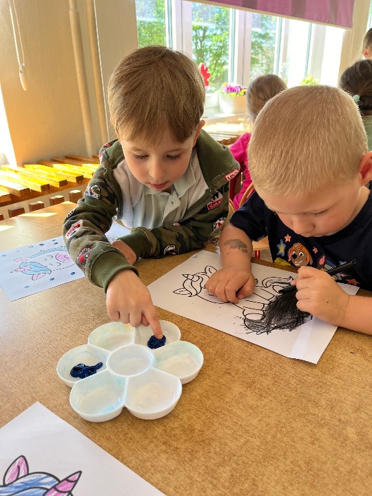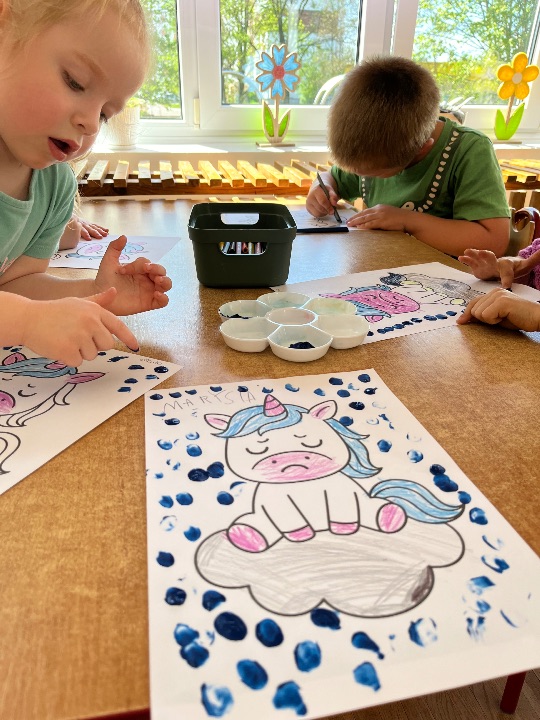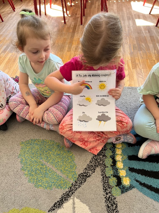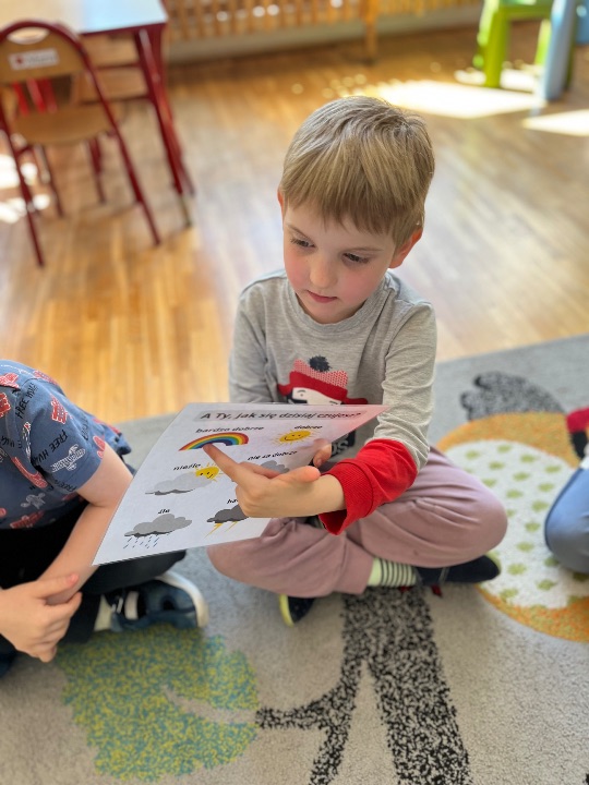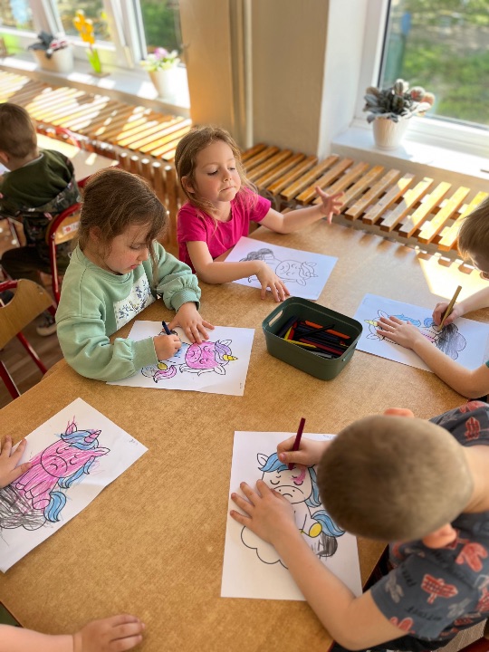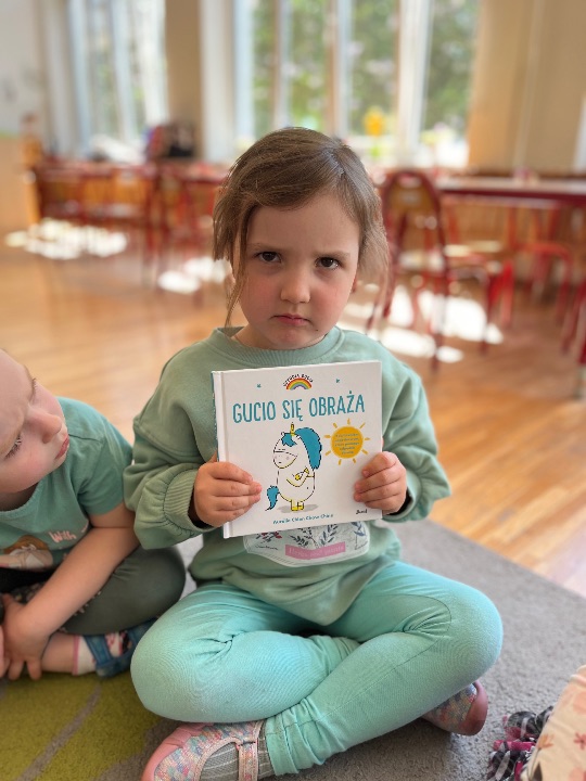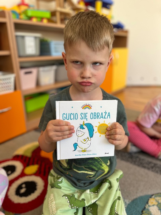 Podczas kolejnych zajęć wynikających z Międzynarodowego Projektu Edukacyjnego „Kolorowe Uczucia Gucia” dzieci wysłuchały bajki pt. „Gucio się obraża”. Historia małego jednorożca była punktem wyjścia do rozmowy o emocjach, szczególnie o obrażaniu się, złości i smutku. Dzieci dzieliły się swoimi doświadczeniami – opowiadały, kiedy i dlaczego się obrażają, co wtedy czują i jak się zachowują. Wspólnie zastanawialiśmy się, w jaki sposób można odgonić „czarną chmurę”. Wykonaliśmy ćwiczenia oddechowe oraz pracę plastyczną.