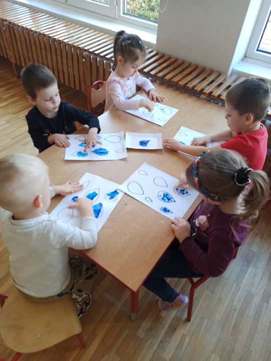 W tym tygodniu grupa II poznała różne interesujące zawody. Między innymi poznaliśmy pracę fryzjera. Dowiedzieliśmy się co robi fryzjer, jakich narzędzi używa, a także... postanowiliśmy stworzyć własne fryzury. Dmuchając w słomkę, rozdmuchiwaliśmy kropelkę farby, która tworzyła kosmyk włosa. Zadanie nie było proste, ale okazało się dobrym ćwiczeniem oddechowym.