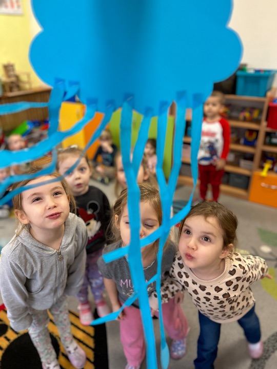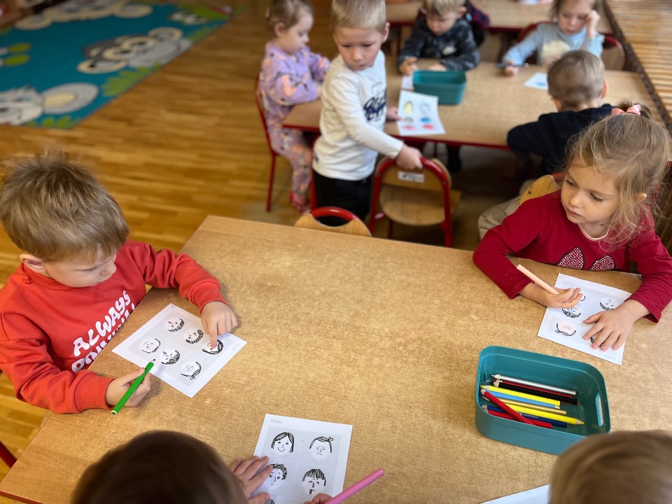 W ramach Miedzynarodowego Projektu Edukacyjnego „Kolorowe Uczucia Gucia” przedszkolaki poznały kolejne uczucie jakim jest smutek. Wysłuchały opowiadania „Gucio się smuci” i wspólnie przegoniły chmurę smutku wykonując ćwiczenia oddechowe.