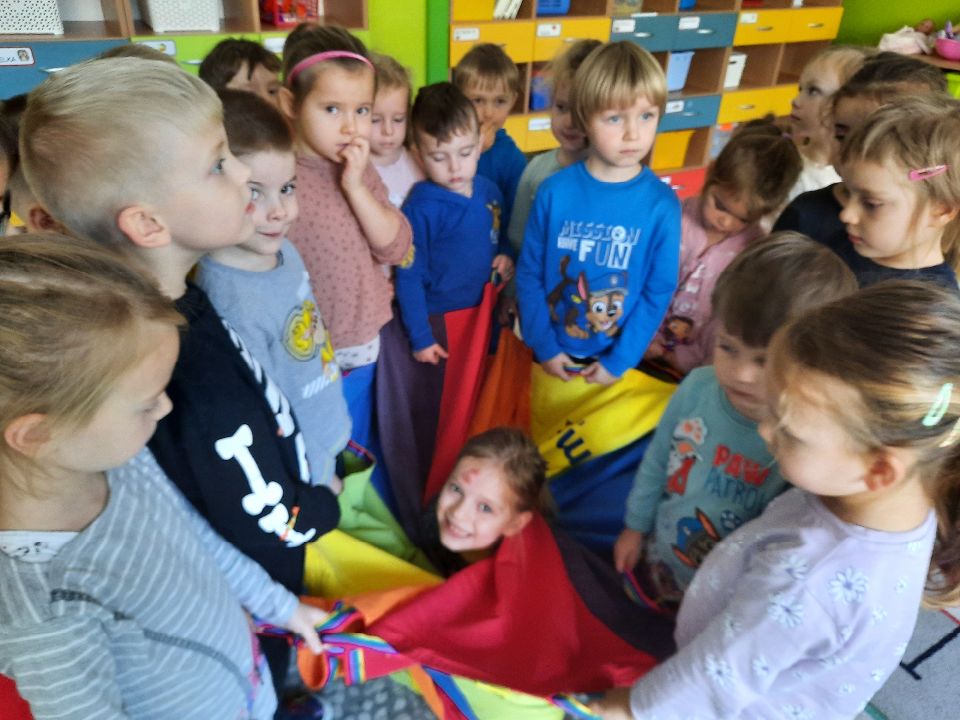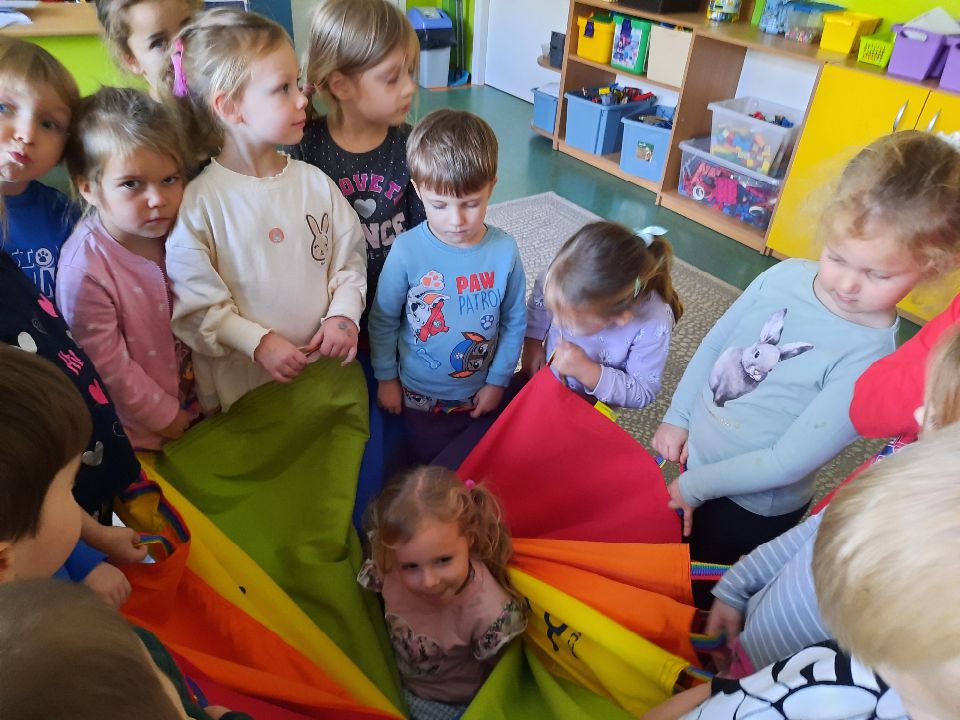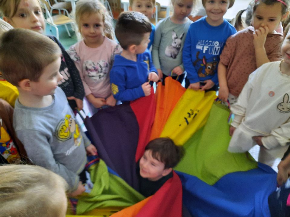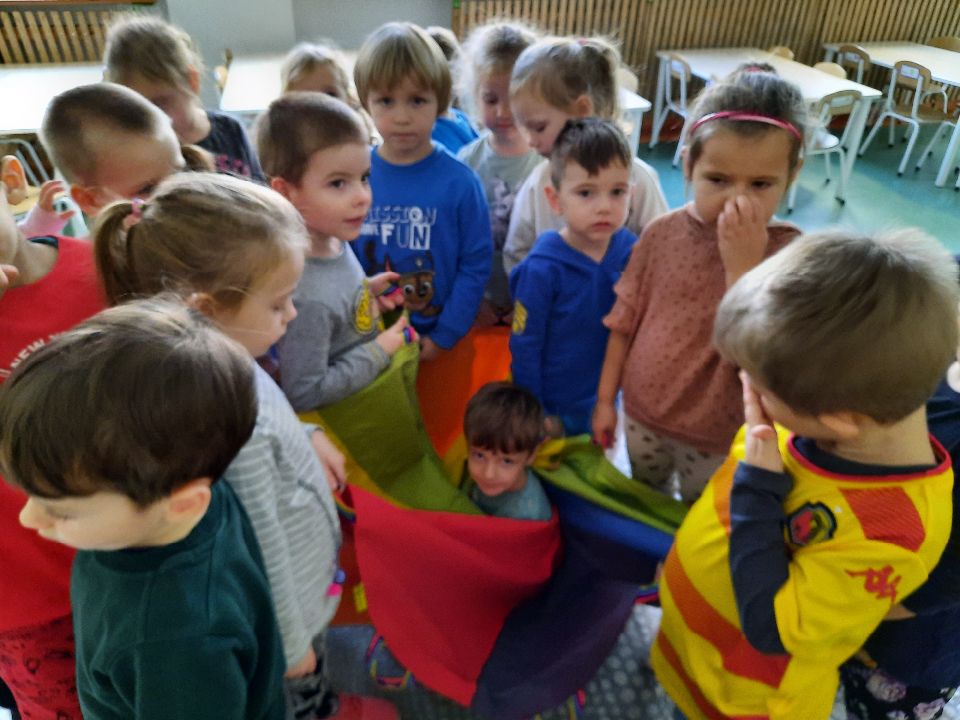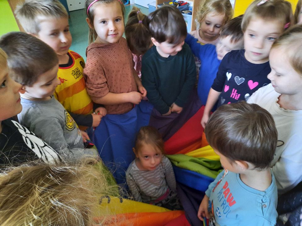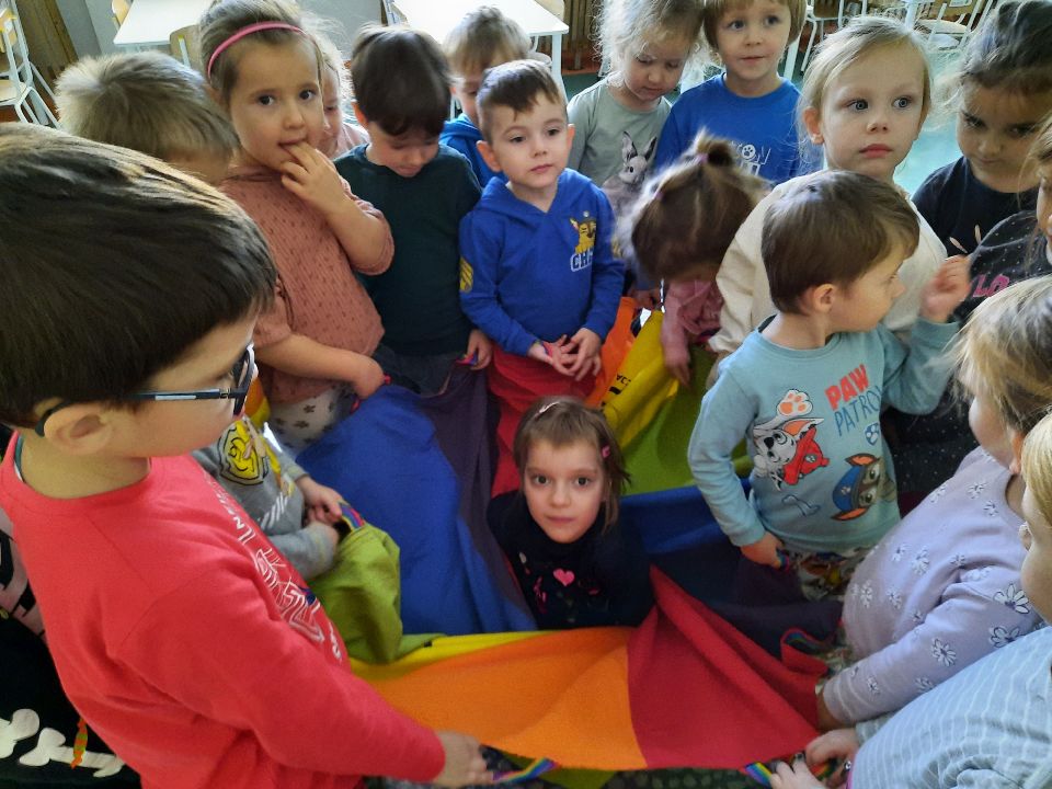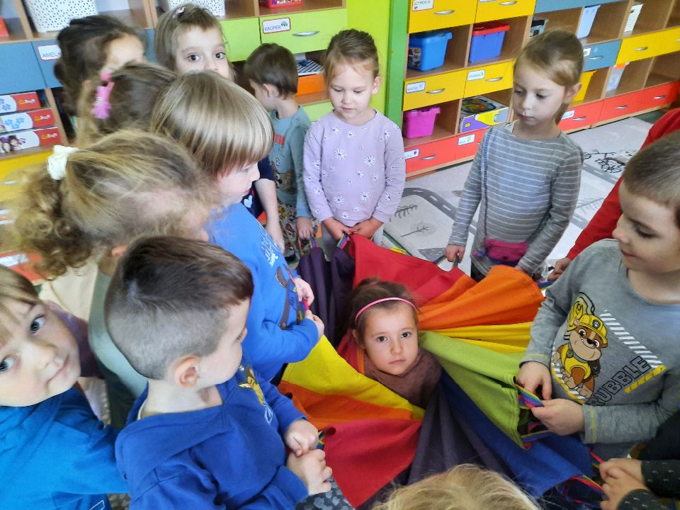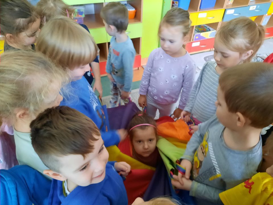 Oto nasze calineczki w kwiatku z chusty animacyjnej. Żeby chłopakom nie było smutno- zasiadły w kwiatku małe elfiki. Najlepszy moment?- gdy skręconą chustę rozkręcaliśmy, a ona wirowała wraz z calineczką lub elfem.