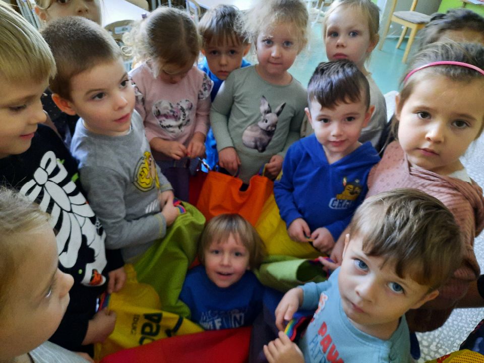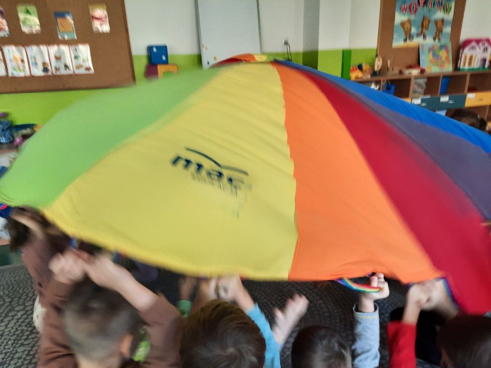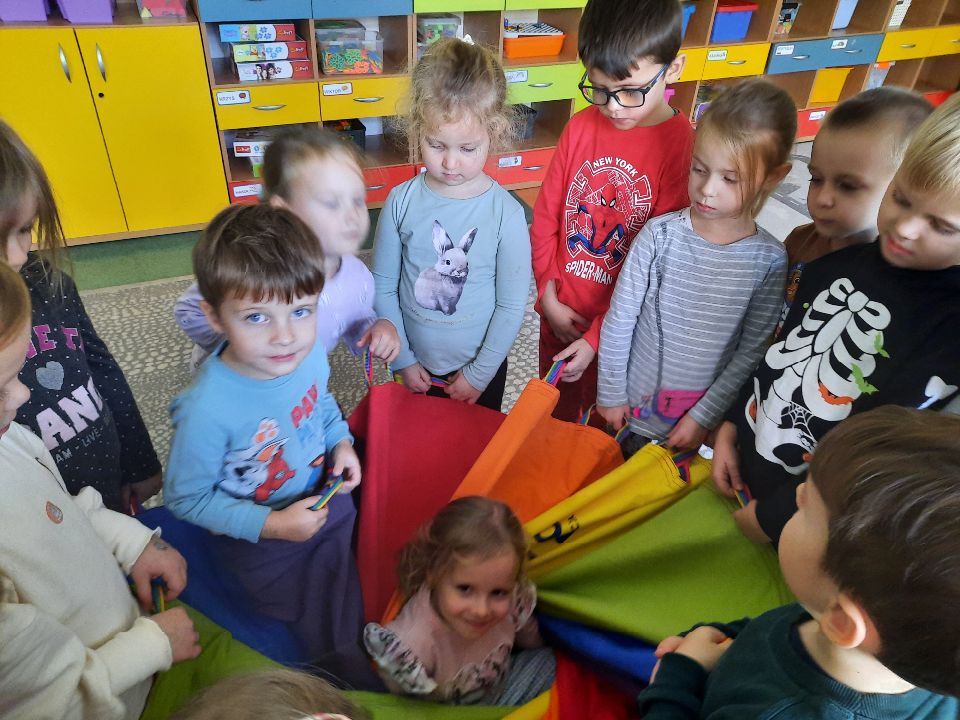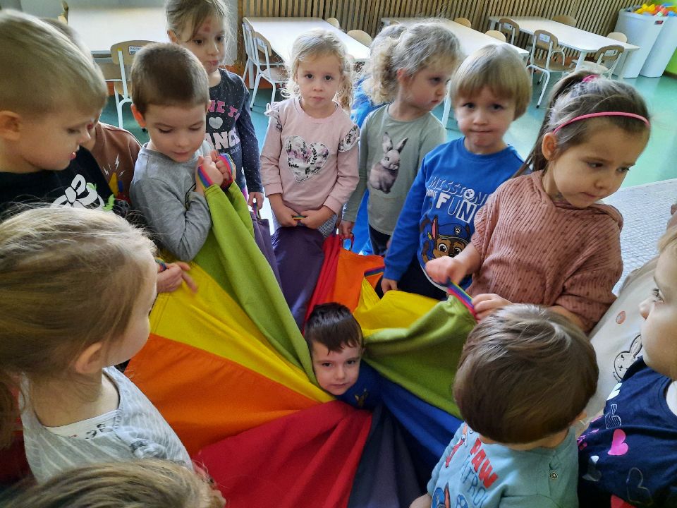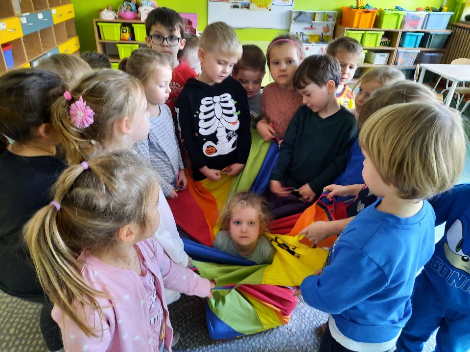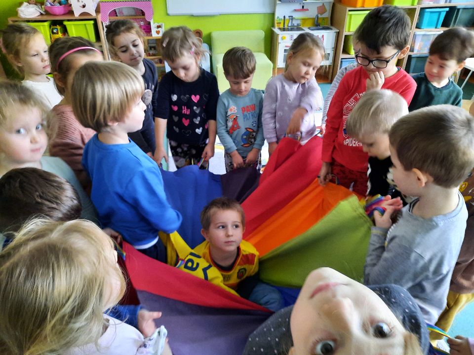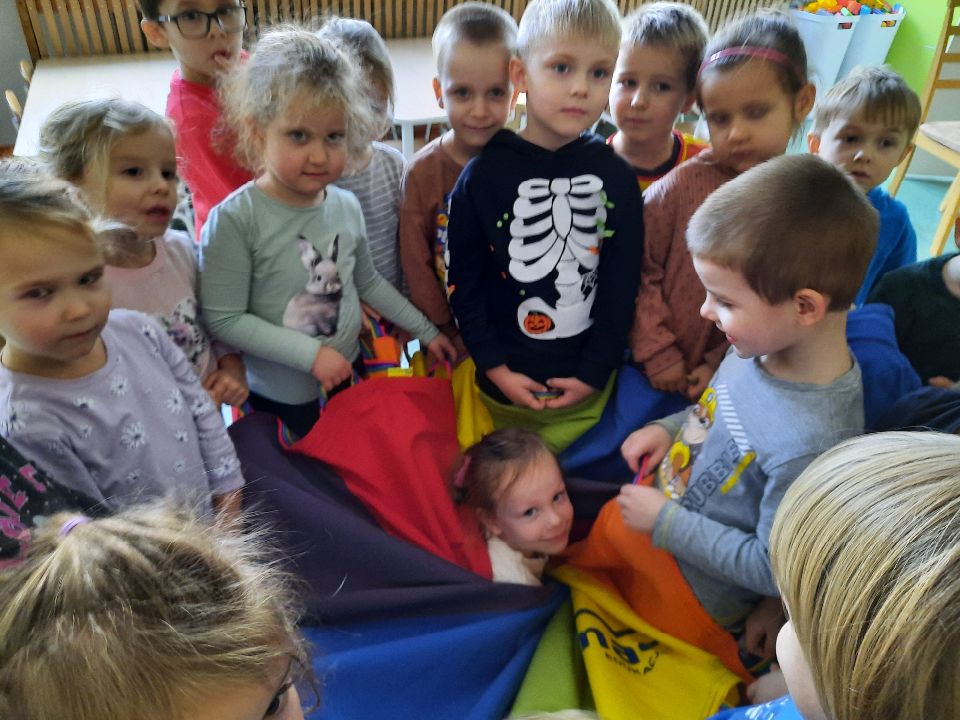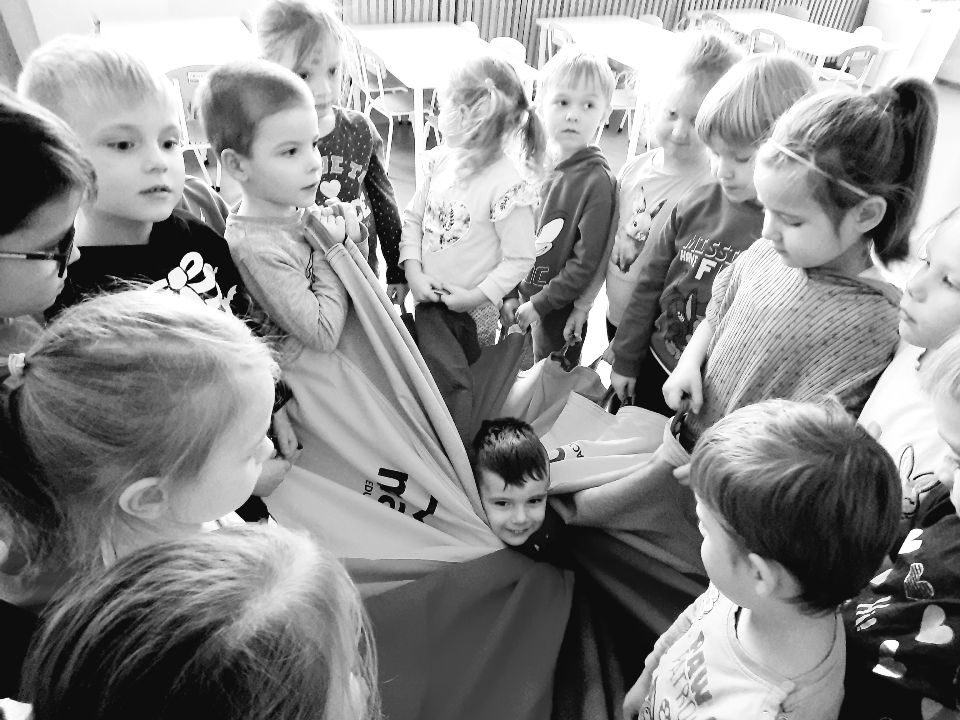 Oto nasze calineczki w kwiatku z chusty animacyjnej. Żeby chłopakom nie było smutno- zasiadły w kwiatku małe elfiki. Najlepszy moment?- gdy skręconą chustę rozkręcaliśmy, a ona wirowała wraz z calineczką lub elfem.