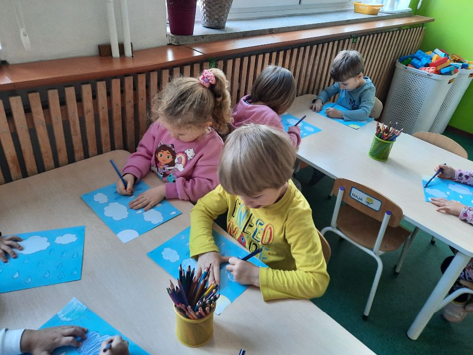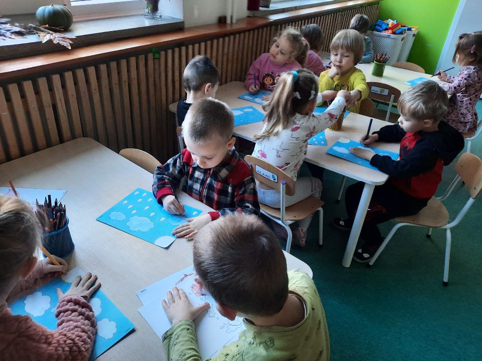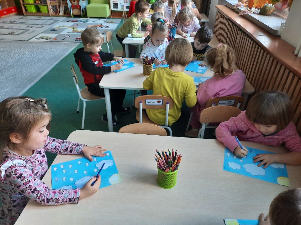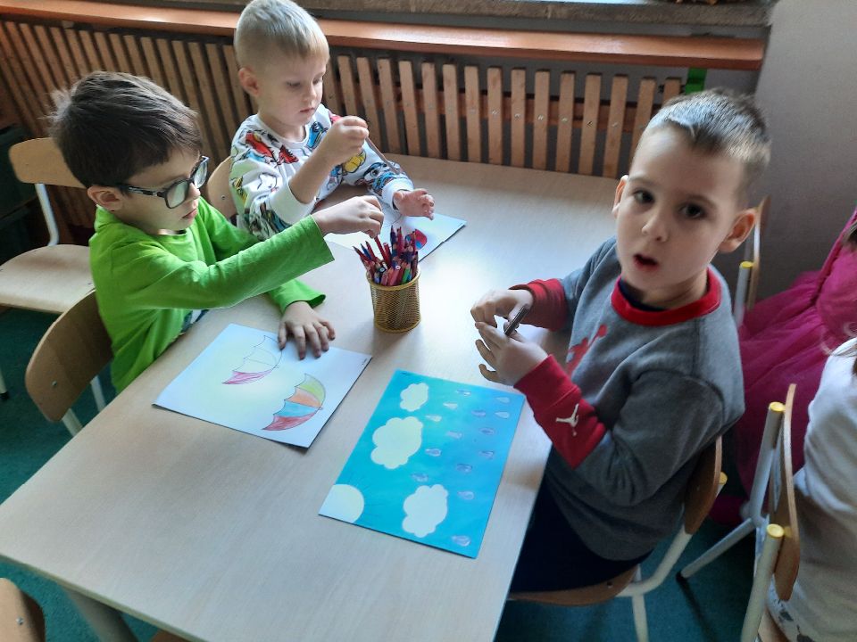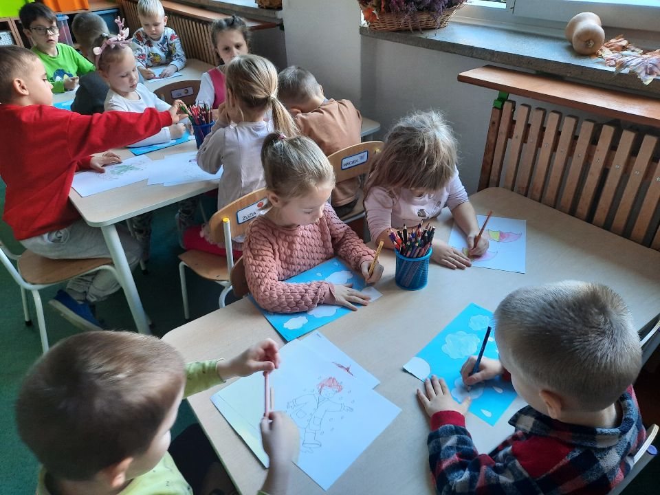 Oto pierwszy etap pracy - kolorowanie. Potem wycinanie i przyklejanie. Czterolatki próbowały swoich sił przy wycinaniu z pomocą pani. Efekt- na tablicy w szatni