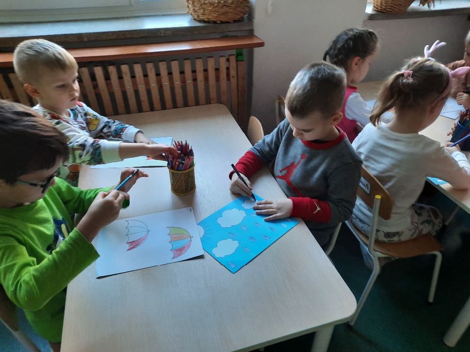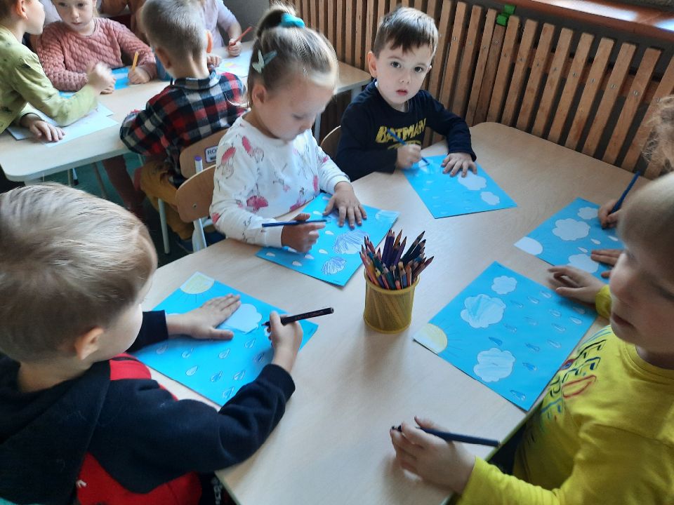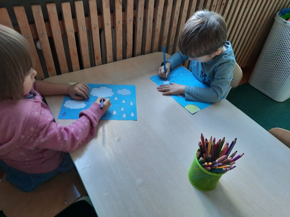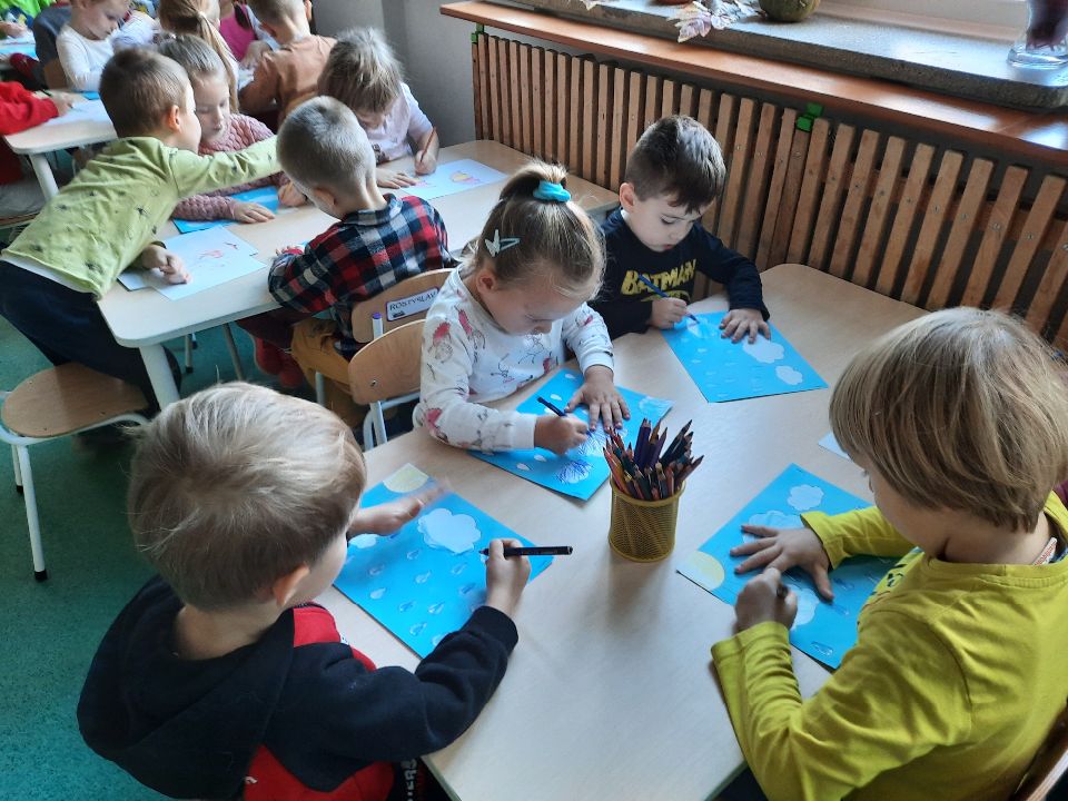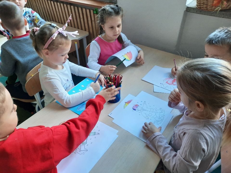 Oto pierwszy etap pracy - kolorowanie. Potem wycinanie i przyklejanie. Czterolatki próbowały swoich sił przy wycinaniu z pomocą pani. Efekt- na tablicy w szatni