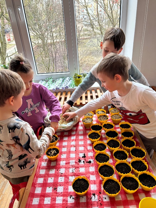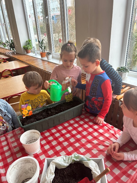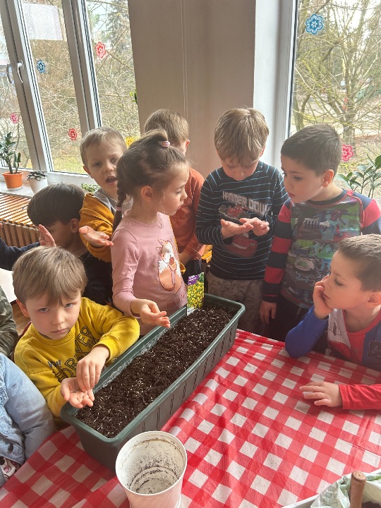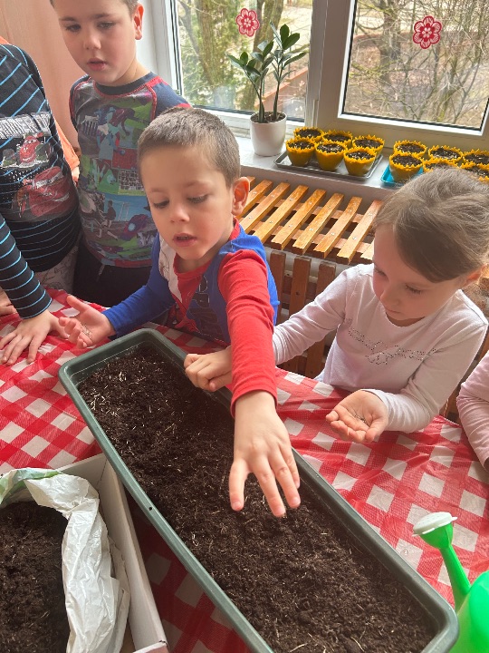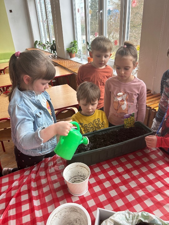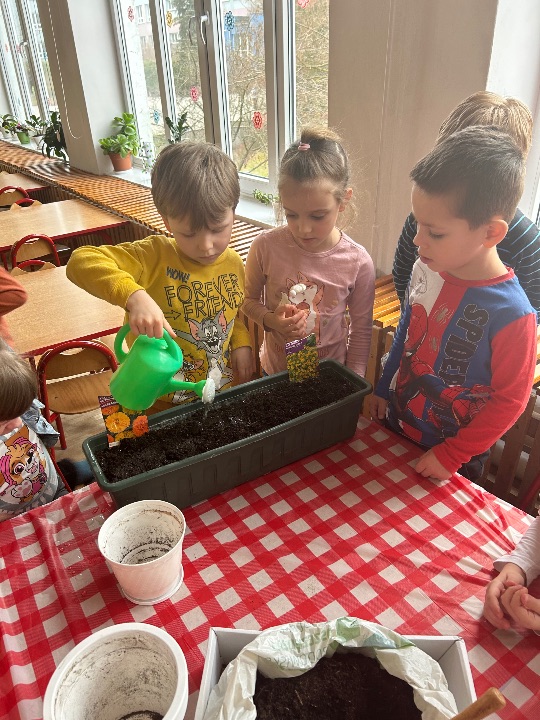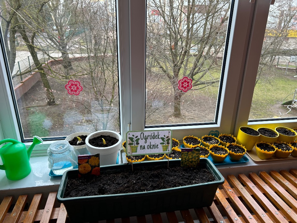 Wiosna zawitała do naszej sali przedszkolnej! Na parapecie okna założyliśmy „zielony ogródek” i prowadzimy hodowlę warzyw i kwiatów (np.: szczypiorek, fasolka, owies, aksamitki i tulipany .Wiemy już, że aby roślinki pięknie rosły potrzebna jest woda i słoneczko. Teraz będziemy każdego dnia je obserwować i podlewać.