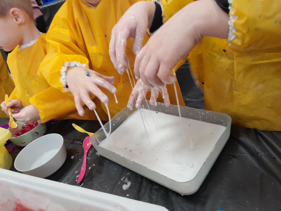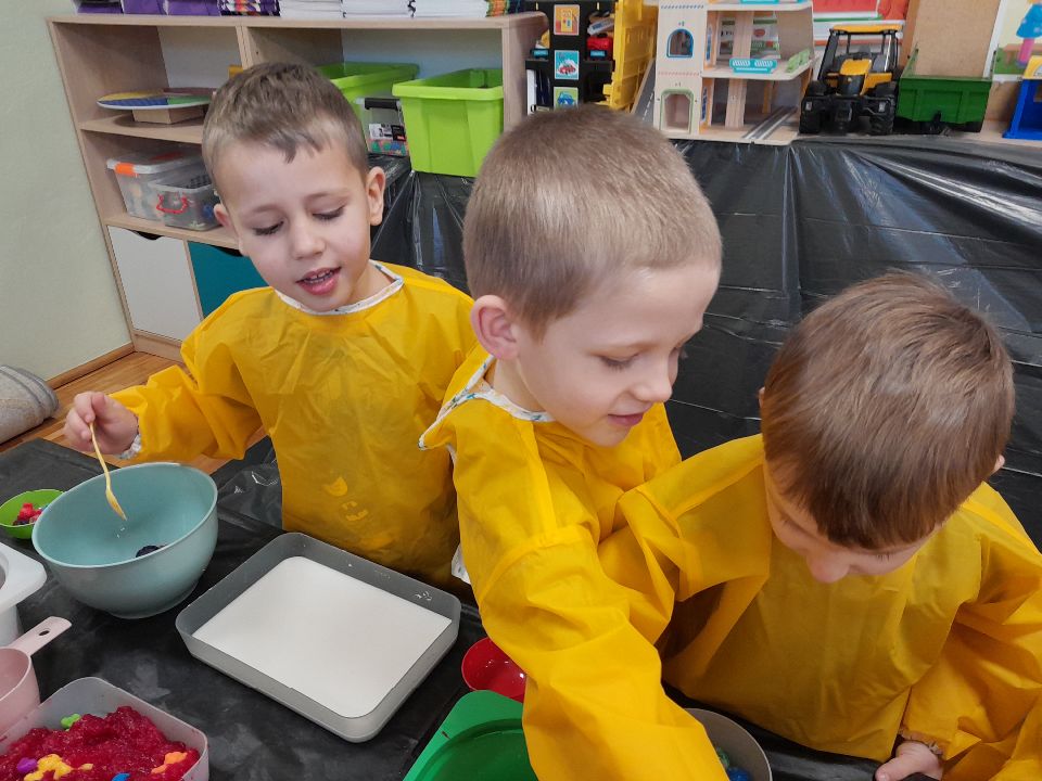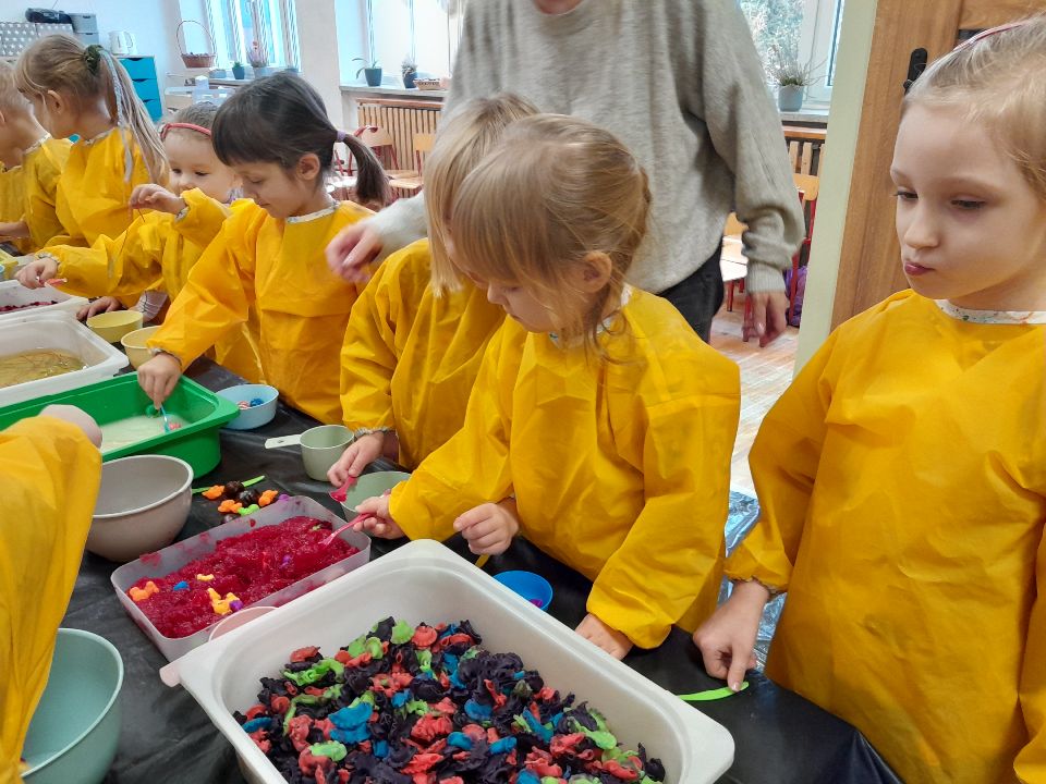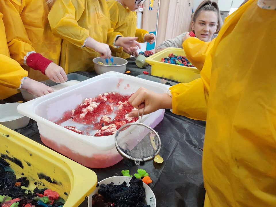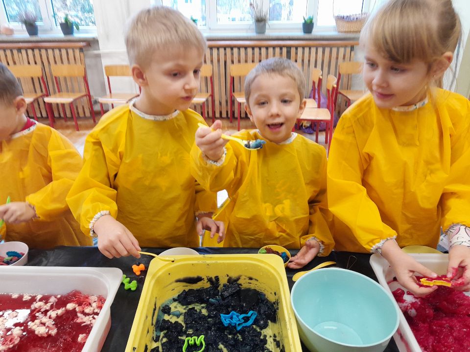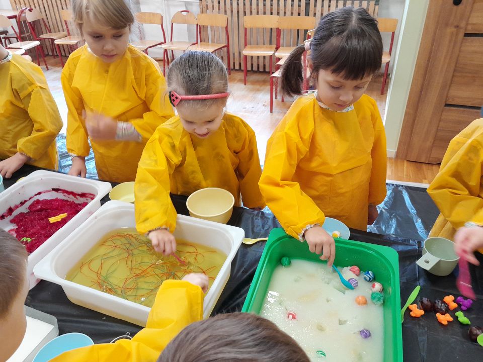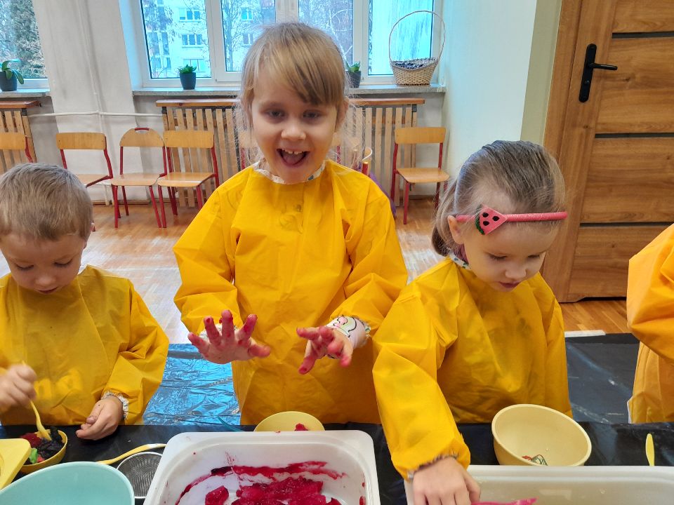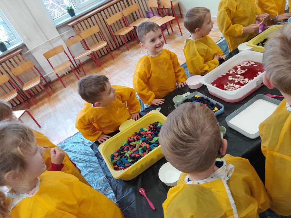 Dzisiaj bawiliśmy się różnymi masami plastycznymi. Były to smakowicie pachnące: galaretka, budyń, kisiel i ciecz nienewtonowska. Ależ to była zabawa.