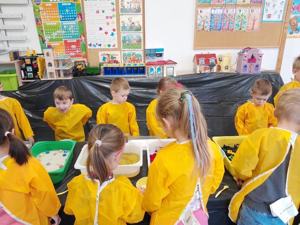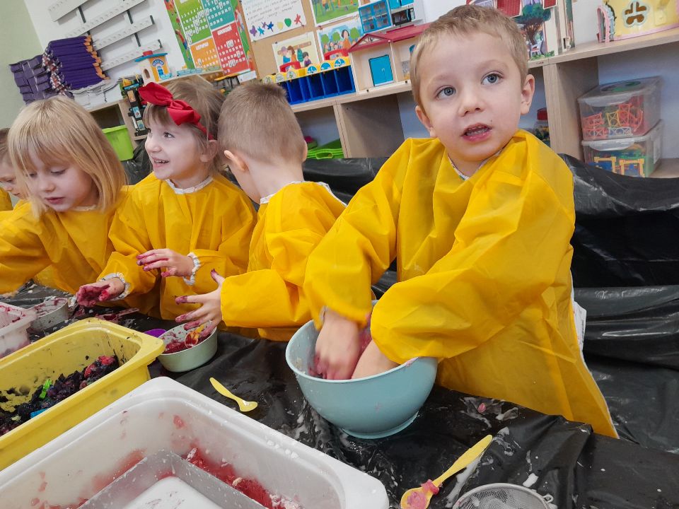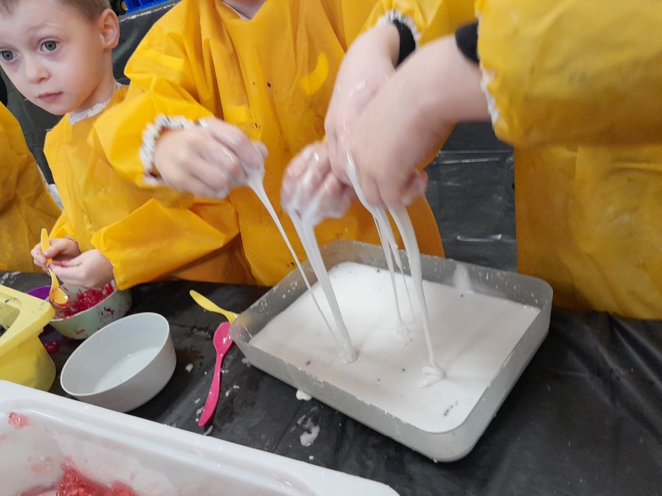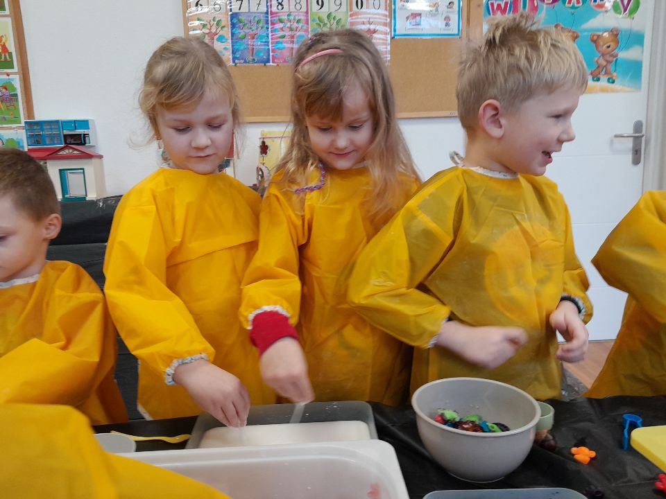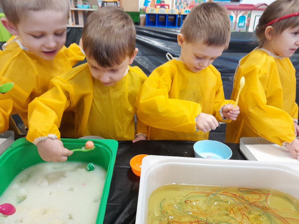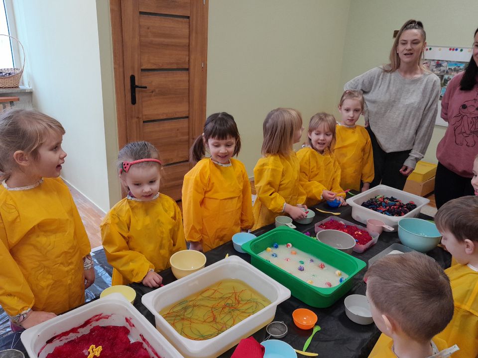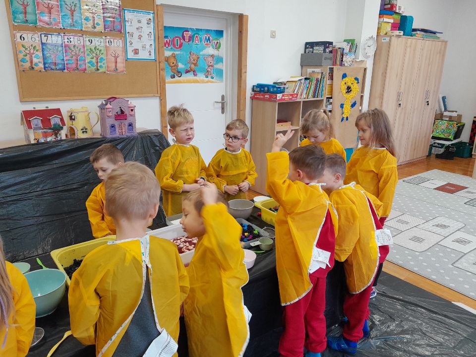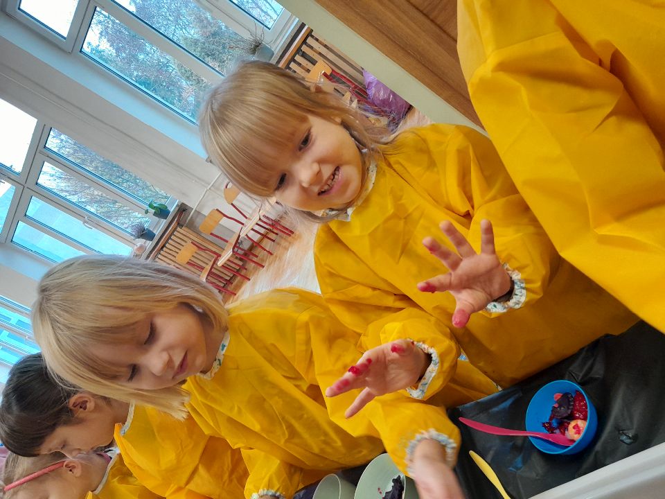 Dzisiaj bawiliśmy się różnymi masami plastycznymi. Były to smakowicie pachnące: galaretka, budyń, kisiel i ciecz nienewtonowska. Ależ to była zabawa.