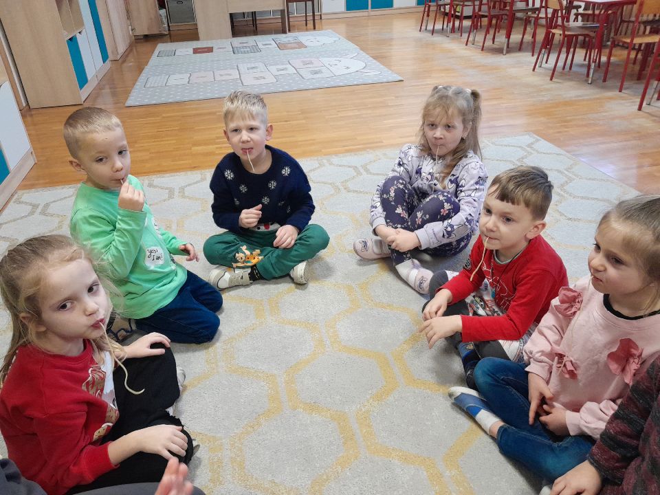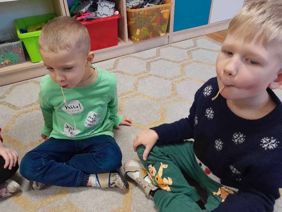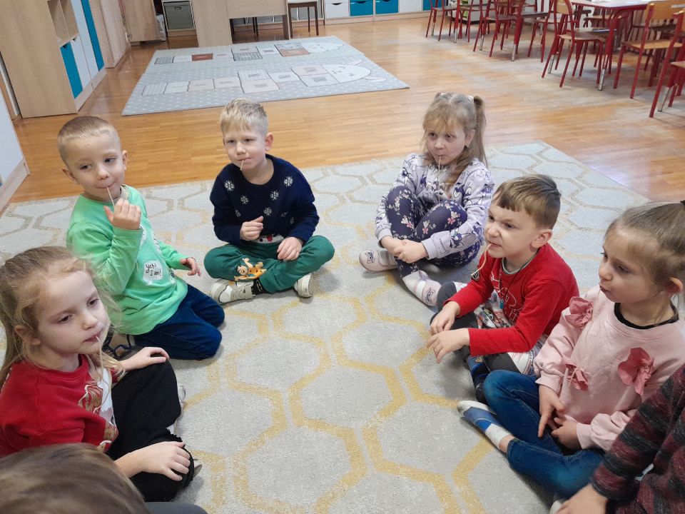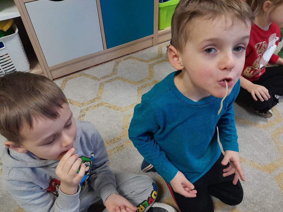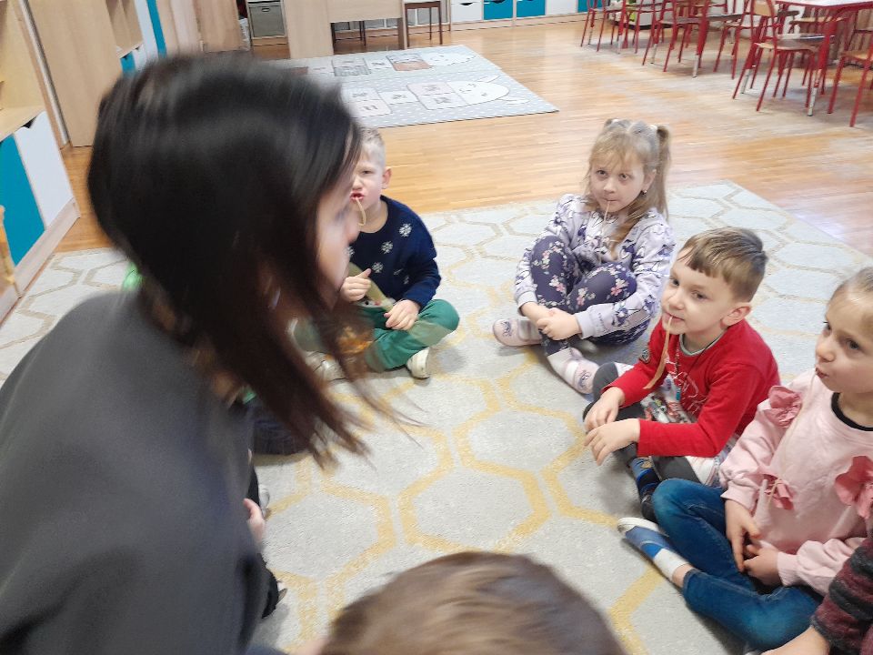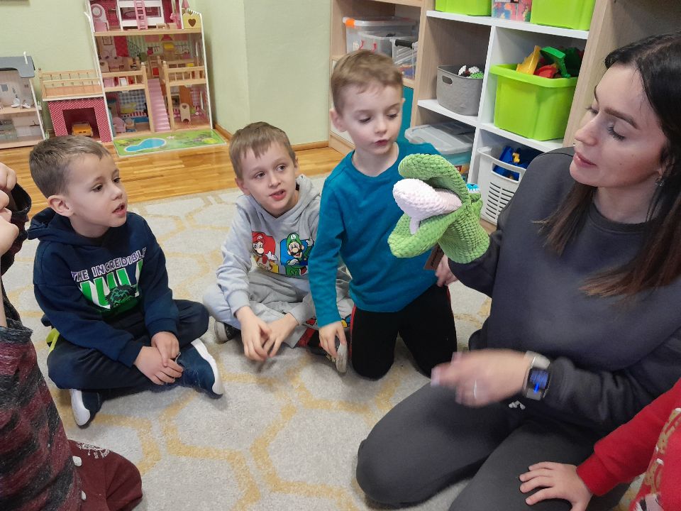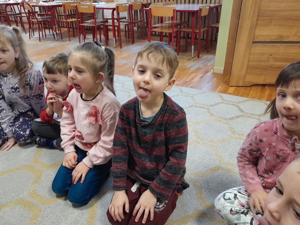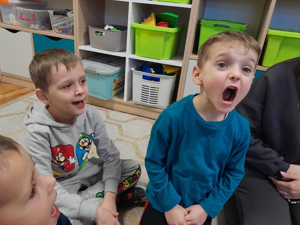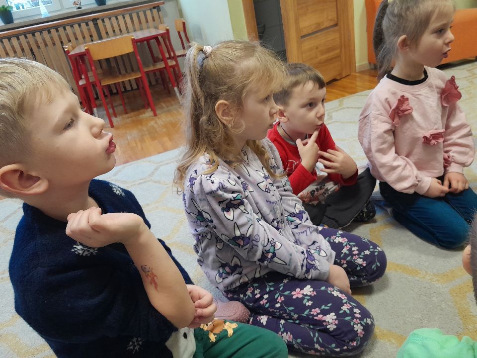 W dniu dzisiejszym gościliśmy w naszej grupie Panią Paulinę, która pracuje w przedszkolu jako logopeda. Nasz gość opowiedział nam o swojej pracy i zajęciach, które prowadzi. Następnie wykonaliśmy kilka ćwiczeń językowych razem z krokodylem, "wciągaliśmy" makaron i zrobiliśmy duszka, który pomagał nam w wykonaniu jednego z ćwiczeń.