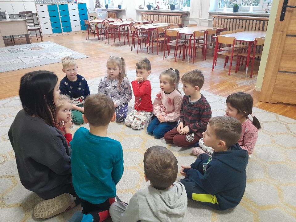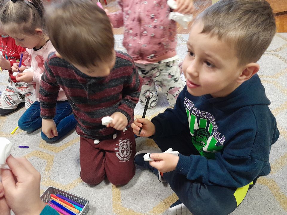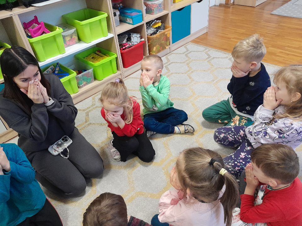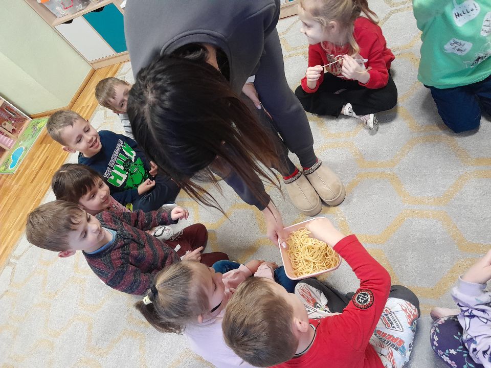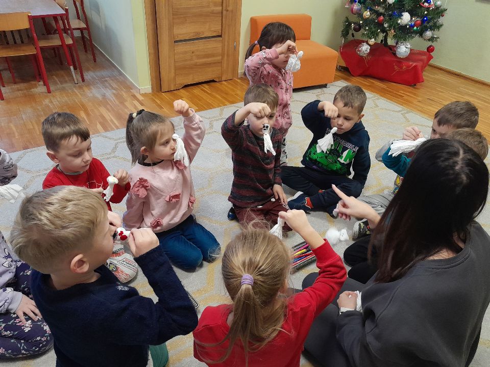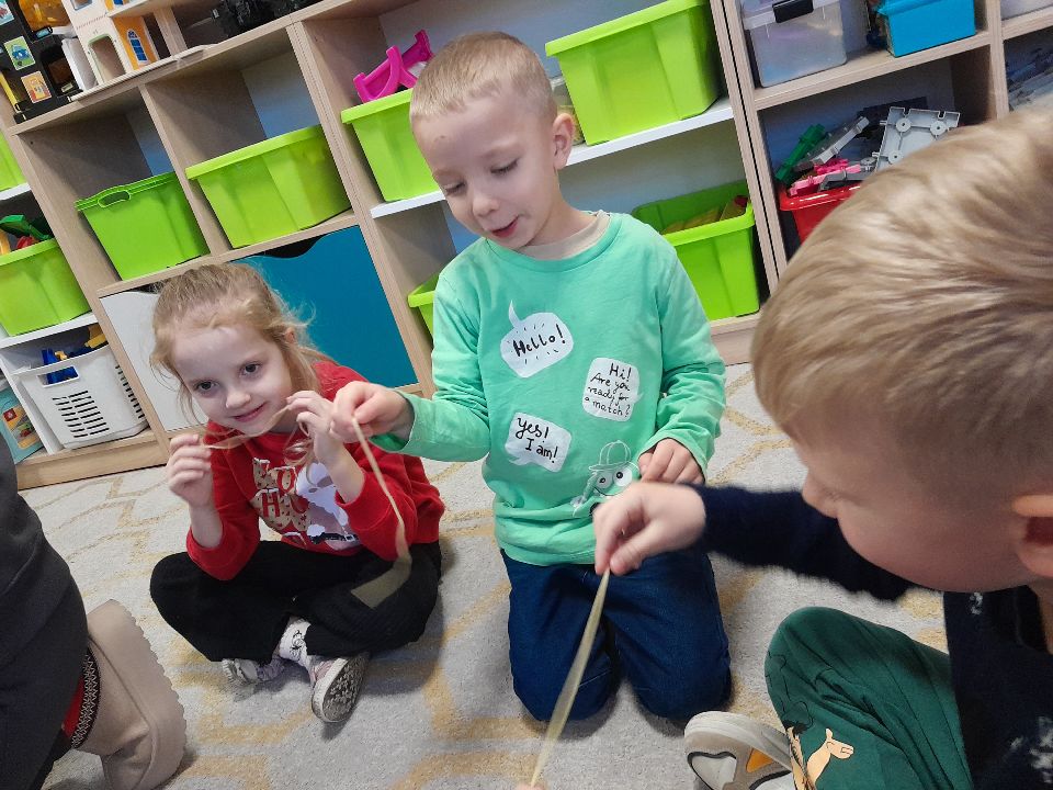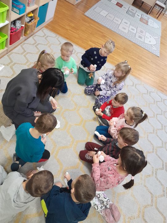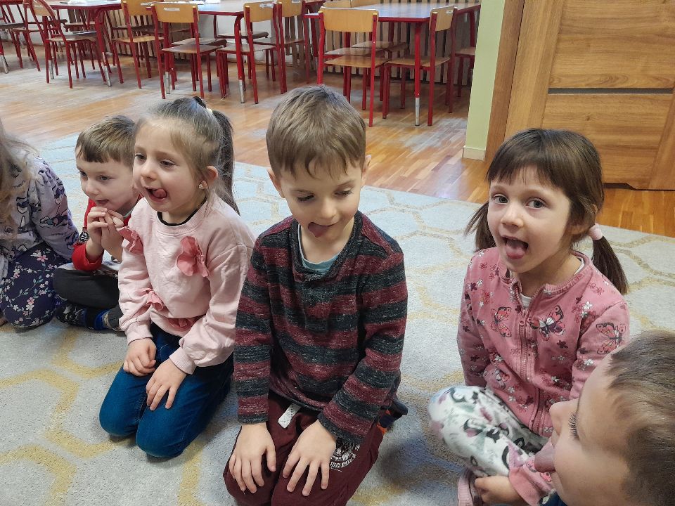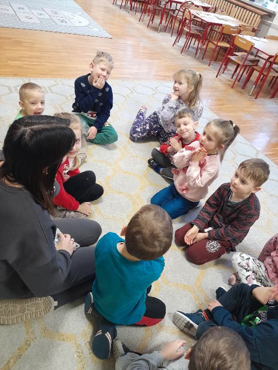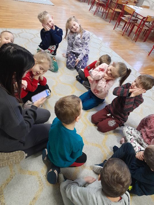 W dniu dzisiejszym gościliśmy w naszej grupie Panią Paulinę, która pracuje w przedszkolu jako logopeda. Nasz gość opowiedział nam o swojej pracy i zajęciach, które prowadzi. Następnie wykonaliśmy kilka ćwiczeń językowych razem z krokodylem, "wciągaliśmy" makaron i zrobiliśmy duszka, który pomagał nam w wykonaniu jednego z ćwiczeń.