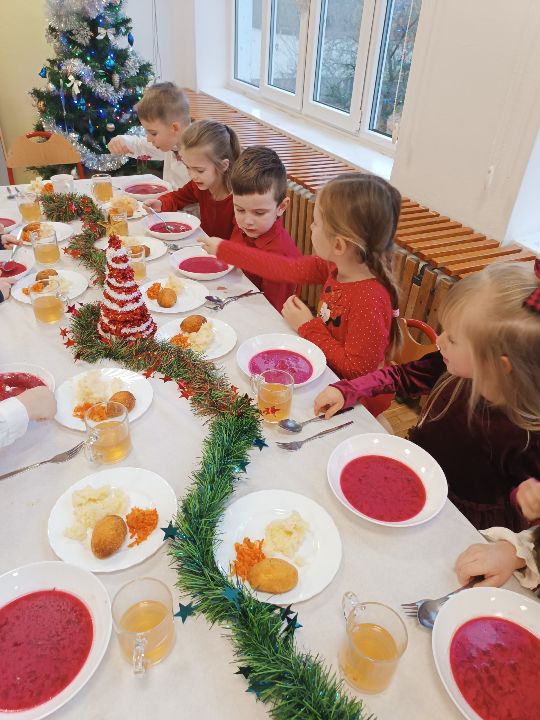 Dzisiejszy dzień w naszym przedszkolu upłynął w wyjątkowo świątecznej atmosferze. Z wielkim zainteresowaniem obejrzeliśmy piękne jasełka przygotowane przez najstarszą grupę, które wprowadziły wszystkich w magiczny nastrój Bożego Narodzenia🌟 Po przedstawieniu dzieliliśmy się opłatkiem, składając sobie serdeczne, dziecięce życzenia, pełne uśmiechu i radości. Następnie wszyscy wspólnie zasiedliśmy do wigilijnego posiłku, który był okazją do rozmów, wspólnego kolędowania i celebrowania tego wyjątkowego czasu. To był dzień pełen ciepła, wzruszeń i świątecznej radości✨🎄
