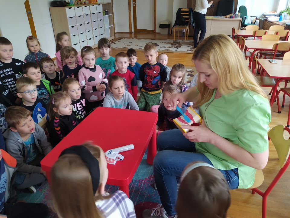 31 maja wzięliśmy udział w zajęciach edukacyjnych ph „Fascynujący świat pszczół”. Warsztaty prowadził mistrz pszczelarstwa - pan Aleksander Rębacz z Męciny Małej. W niezwykle barwny i interesujący sposób pan Aleksander przedstawił życie i pracę pszczół. Przyniósł do przedszkola kombinezon ochronny oraz różne narzędzia niezbędne w pracy pszczelarza, demonstrował jak się ich używa i do czego służą. Dzieci poznały nazwy mieszkańców ula, dowiedziały się o tym, że życie pszczół jest bardzo zorganizowane, a każda pszczółka ma do wypełnienia swoje zadanie. Opowieść wzbogacana była pięknymi ilustracjami i figurkami pszczół. Niezapomnianym doświadczeniem było obserwowanie żywych pszczół w szklanym ulu. Oczywiście była degustacja miodu i pyłku kwiatowego. Na koniec każde dziecko otrzymało certyfikat potwierdzający udział w zajęciach, drewnianą szpatułkę do smarowania miodu, własnoręcznie wykonaną świeczkę z wosku pszczelego oraz książeczkę autorstwa pana Aleksandra.