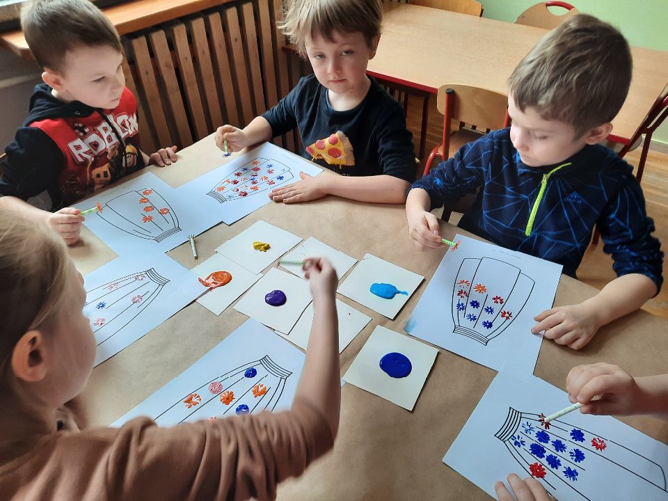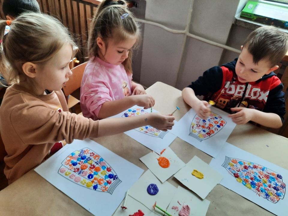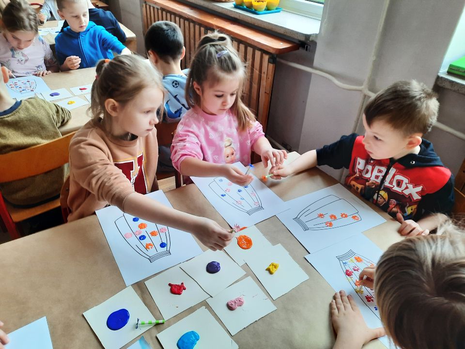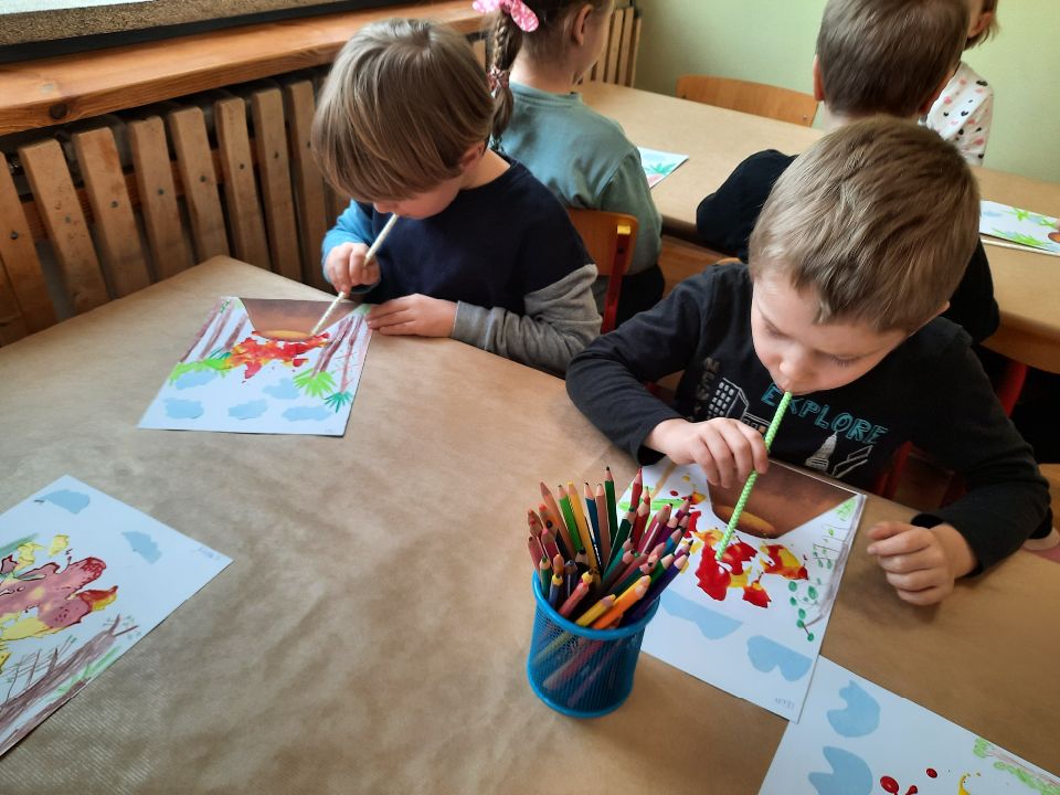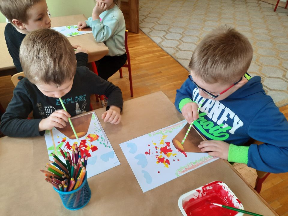 Krople farby, które spadły na kartkę, rozdmuchane słomkami przez dzieci zamieniły się w czerwono - złotą lawę wybuchającą z wulkanu w Jurajskim Parku. Pocięta słomka zamoczona w różnych kolorach farby zamieniła się w stempelki, spod których wyłoniły się kwiaty ozdabiające suknie Pani Wiosny.