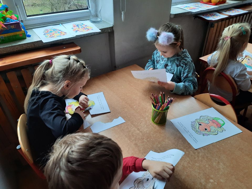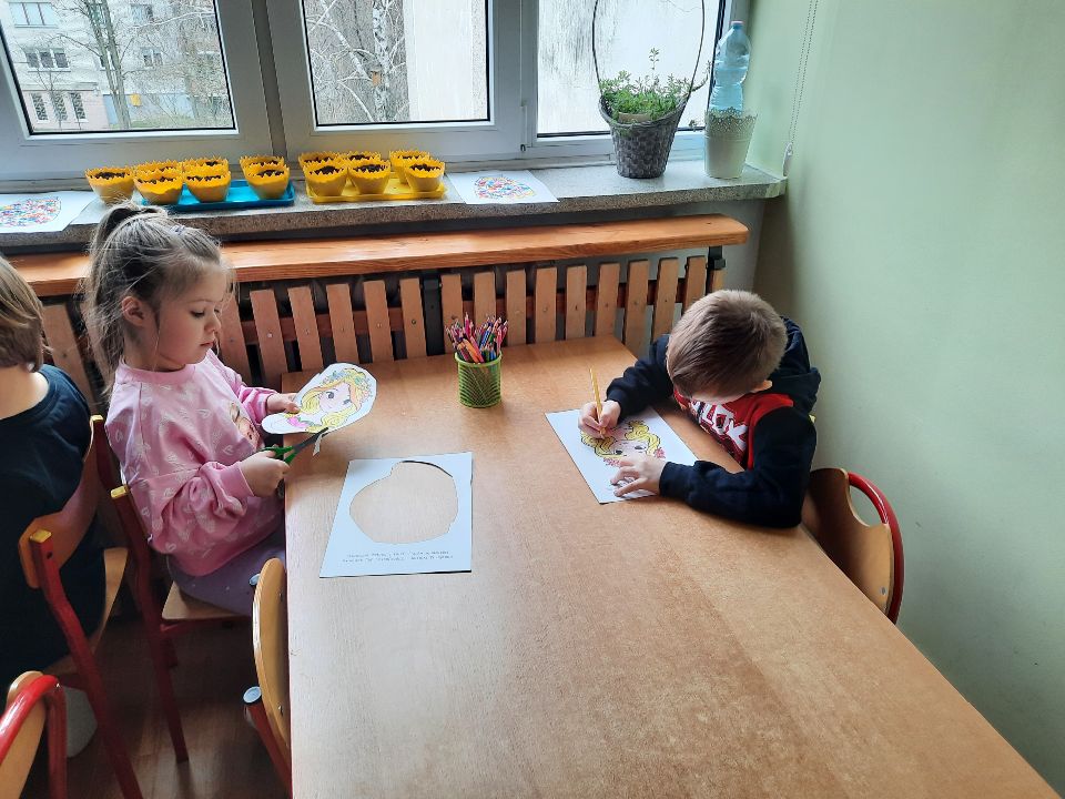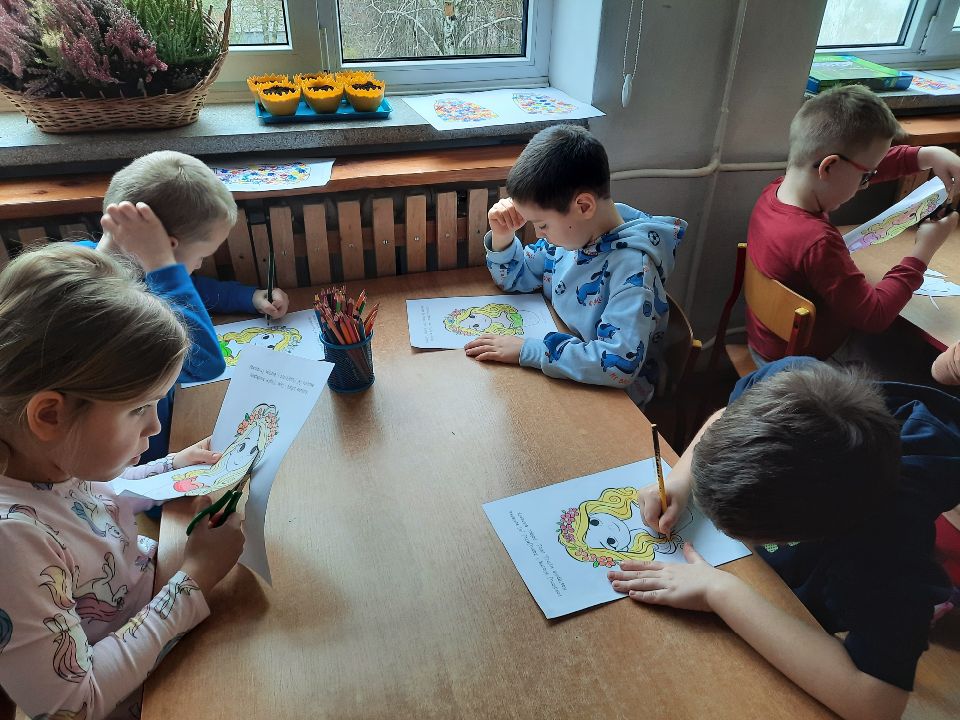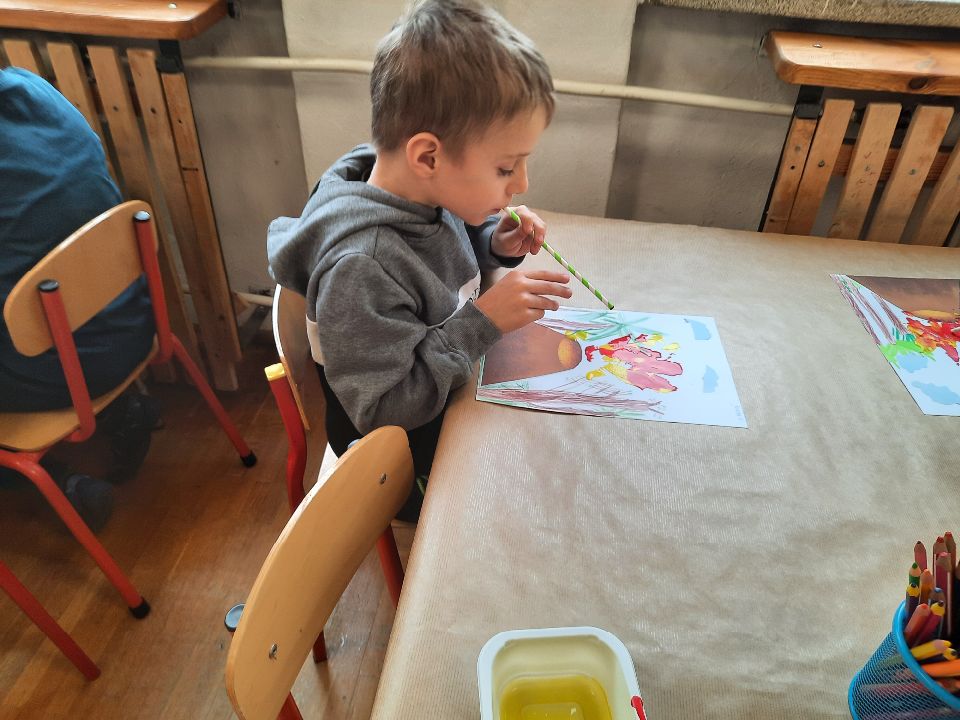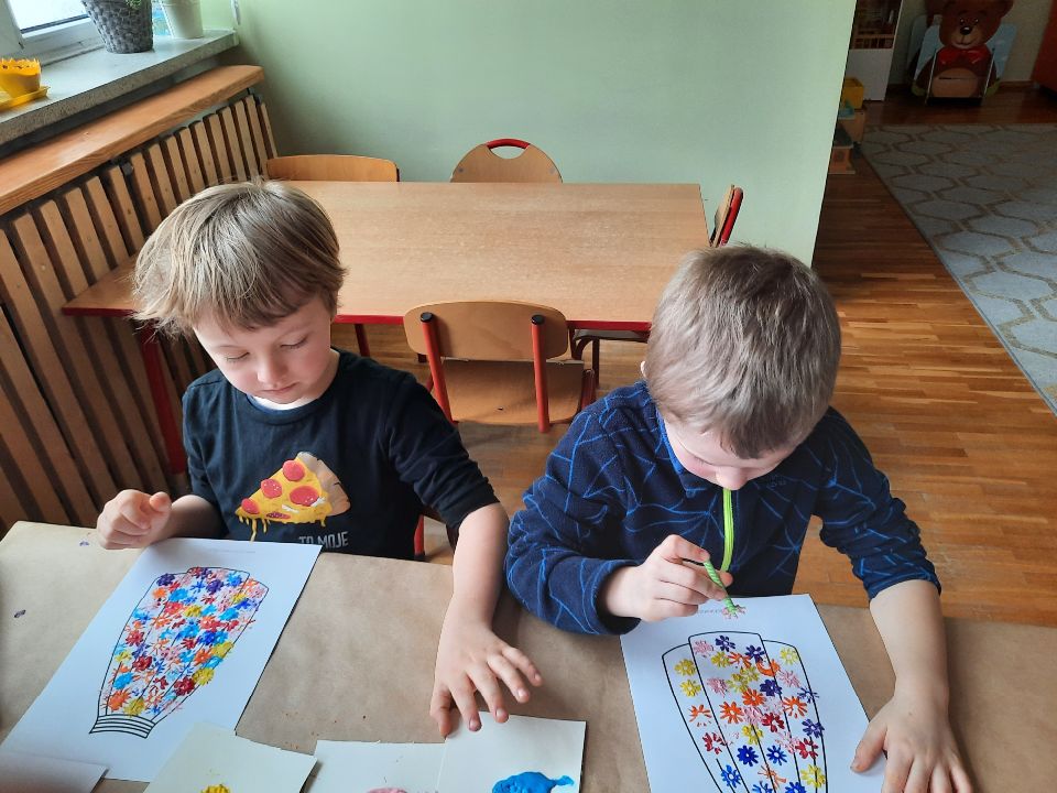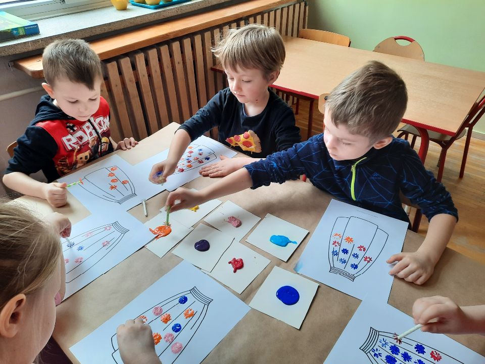 Krople farby, które spadły na kartkę, rozdmuchane słomkami przez dzieci zamieniły się w czerwono - złotą lawę wybuchającą z wulkanu w Jurajskim Parku. Pocięta słomka zamoczona w różnych kolorach farby zamieniła się w stempelki, spod których wyłoniły się kwiaty ozdabiające suknie Pani Wiosny.