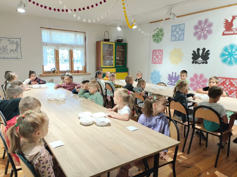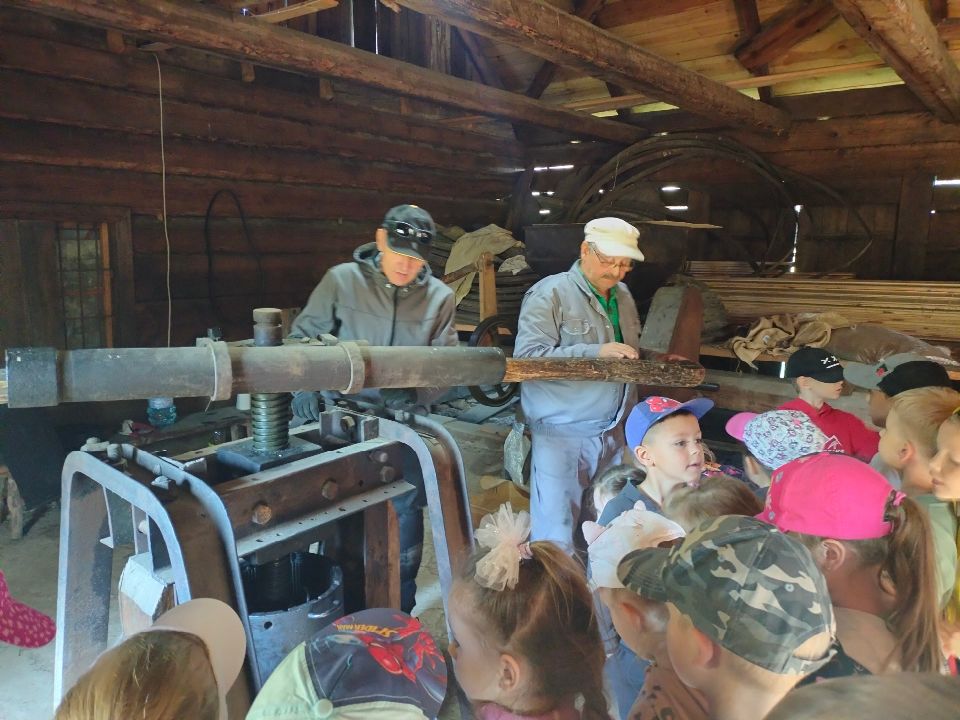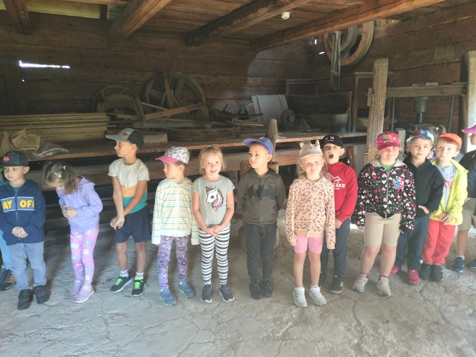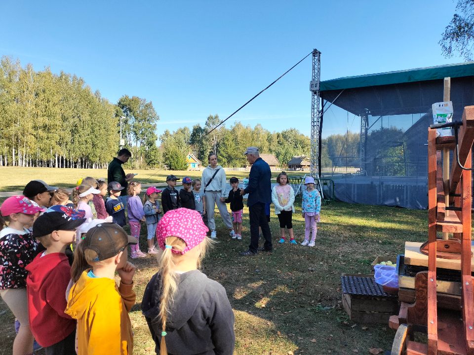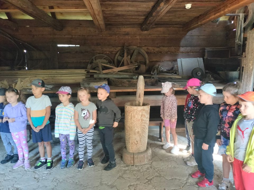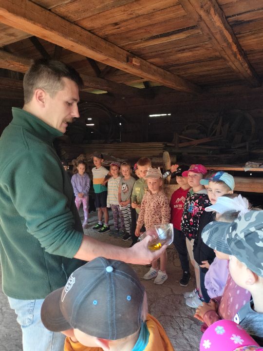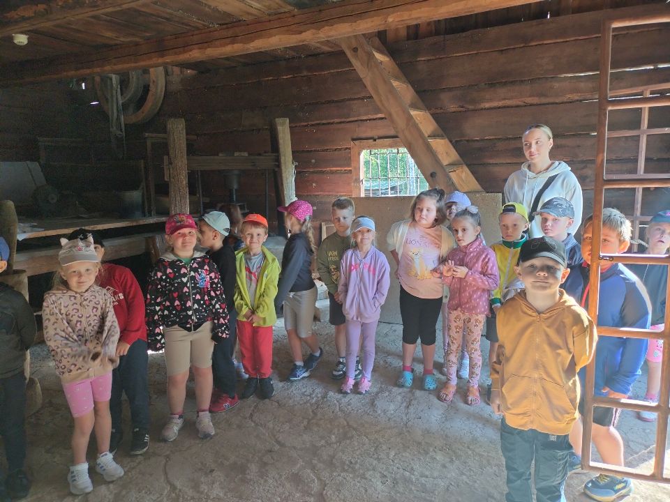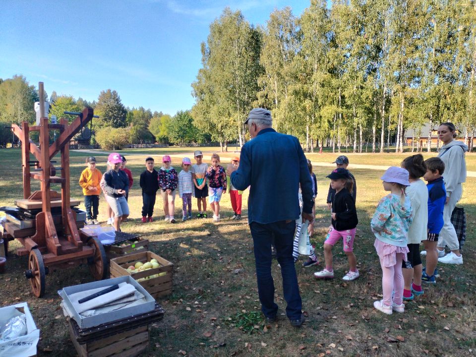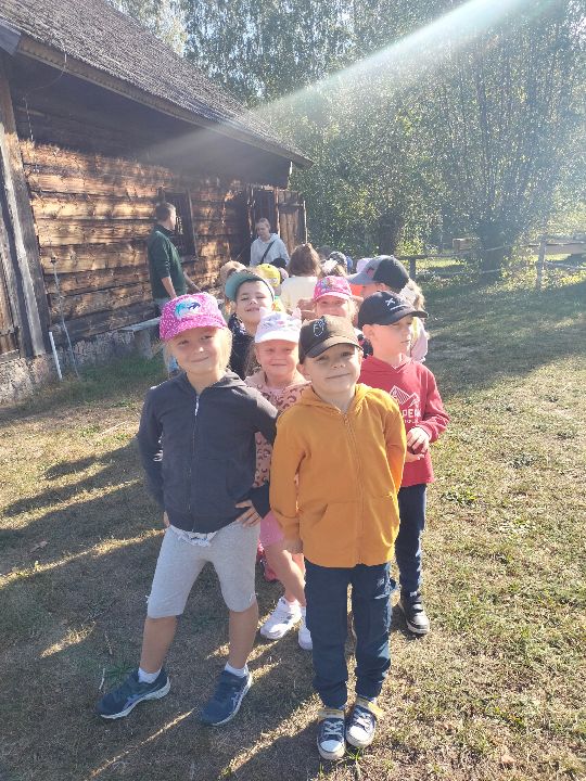 Dnia 23.09.2024 roku nasza grupa wspólnie z grupą V wybrała się na wycieczkę do Podlaskiego Muzeum Kultury Ludowej na warsztaty pt.: "Babie lato w skansenie". Na początku dzieci mogły zaobserwować jak dawniej wyglądał proces wyciskania soków owocowych i tłoczenia oleju. Oczywiście czekała na nas degustacja świeżo wyciśniętych specjałów. Następnie uczestniczyliśmy w audycji muzycznej "Nasze Podlasie" w dźwiękach jesieni, podczas której posłuchaliśmy znanych pieśni ludowych. Na koniec każdy przedszkolak wykonał obrazek z ziaren, który mógł zabrać na pamiątkę do domu. Wróciliśmy bardzo zadowoleni i uśmiechnięci.