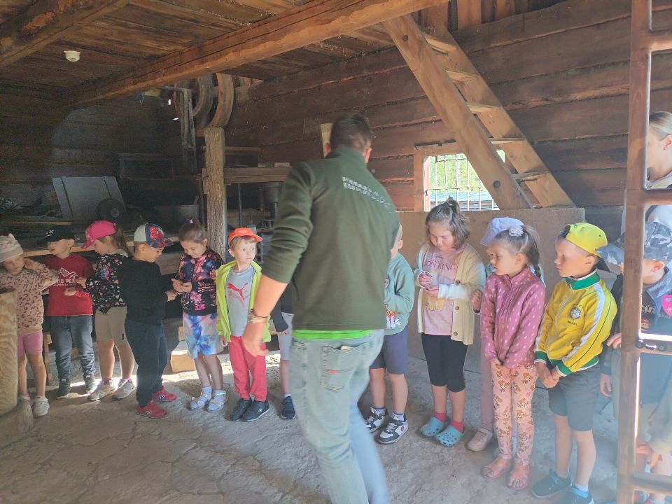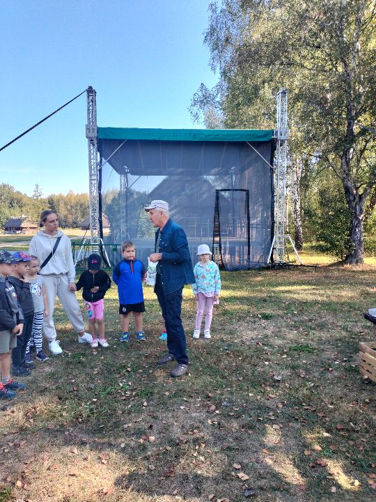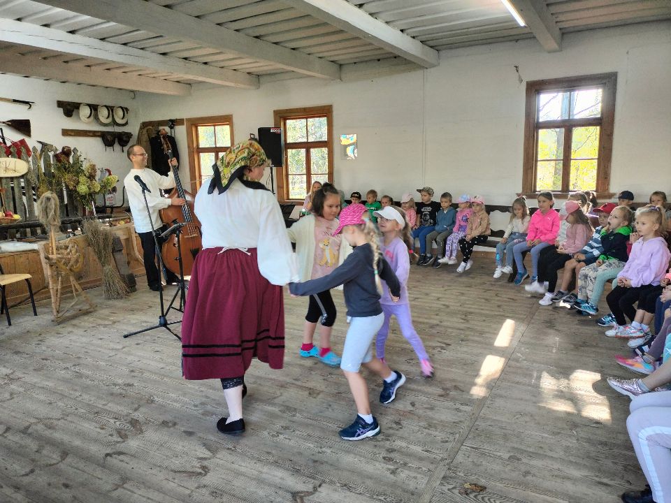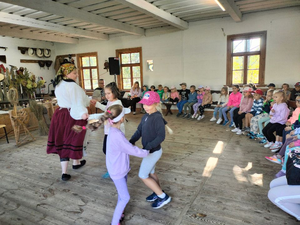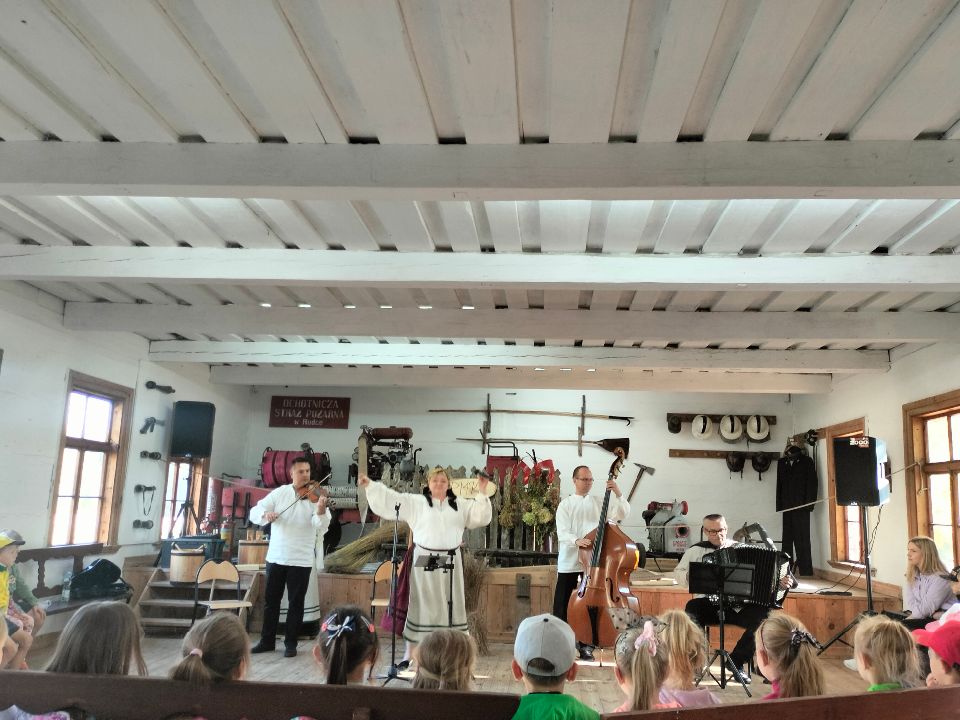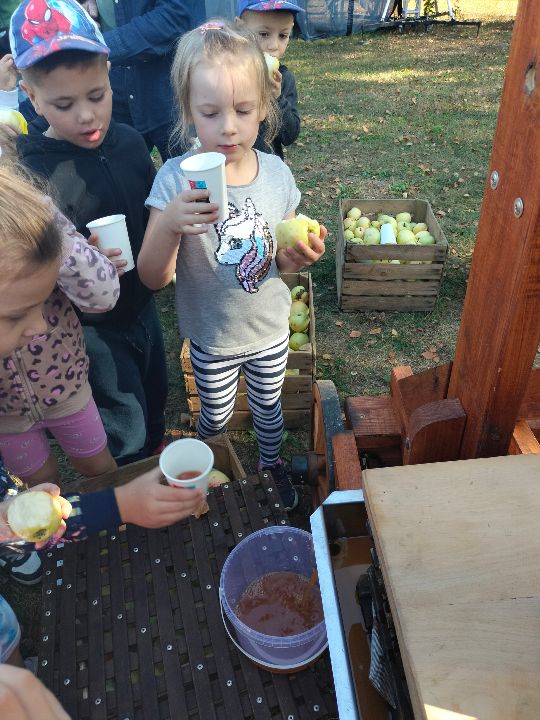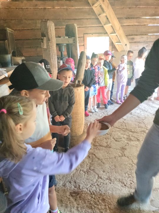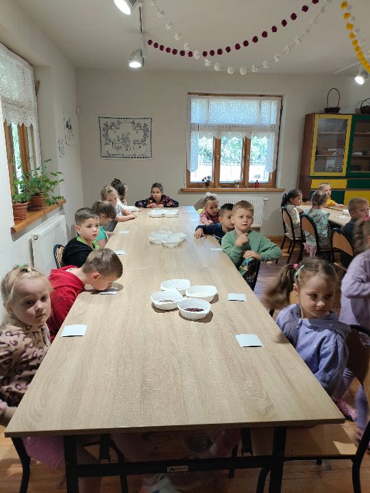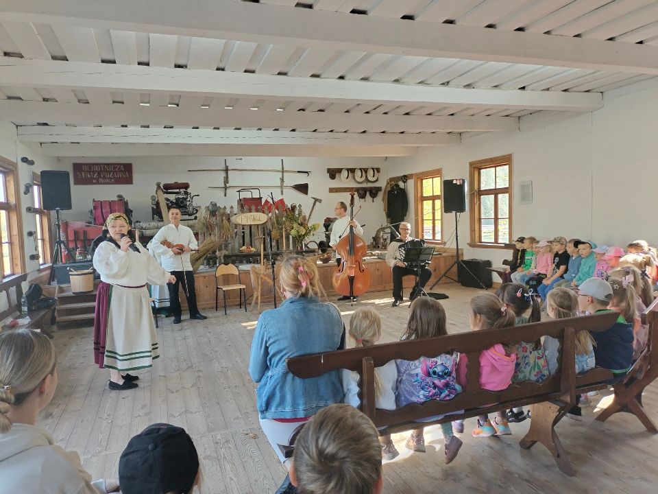 Dnia 23.09.2024 roku nasza grupa wspólnie z grupą V wybrała się na wycieczkę do Podlaskiego Muzeum Kultury Ludowej na warsztaty pt.: "Babie lato w skansenie". Na początku dzieci mogły zaobserwować jak dawniej wyglądał proces wyciskania soków owocowych i tłoczenia oleju. Oczywiście czekała na nas degustacja świeżo wyciśniętych specjałów. Następnie uczestniczyliśmy w audycji muzycznej "Nasze Podlasie" w dźwiękach jesieni, podczas której posłuchaliśmy znanych pieśni ludowych. Na koniec każdy przedszkolak wykonał obrazek z ziaren, który mógł zabrać na pamiątkę do domu. Wróciliśmy bardzo zadowoleni i uśmiechnięci.