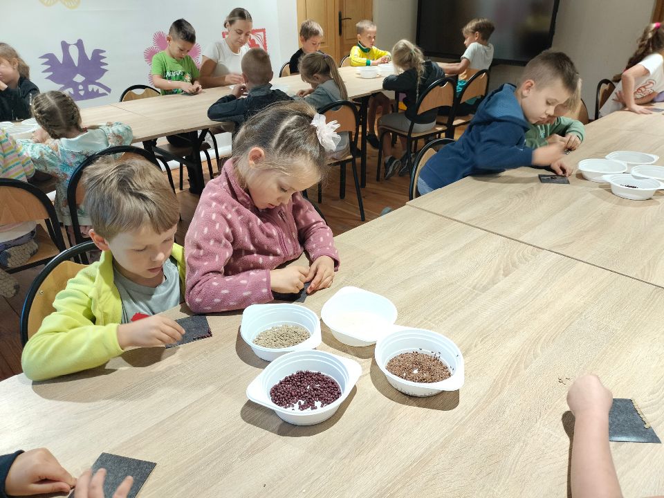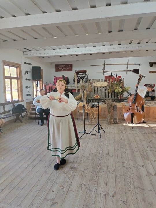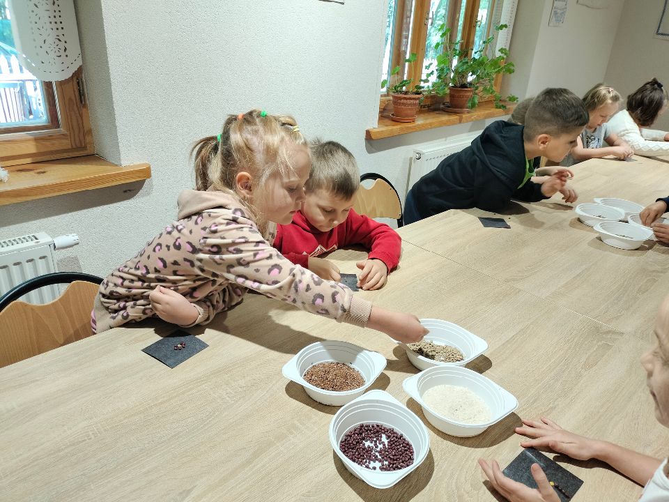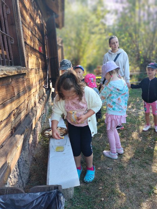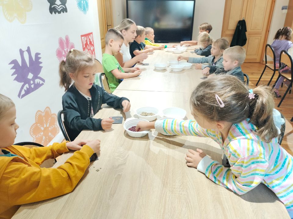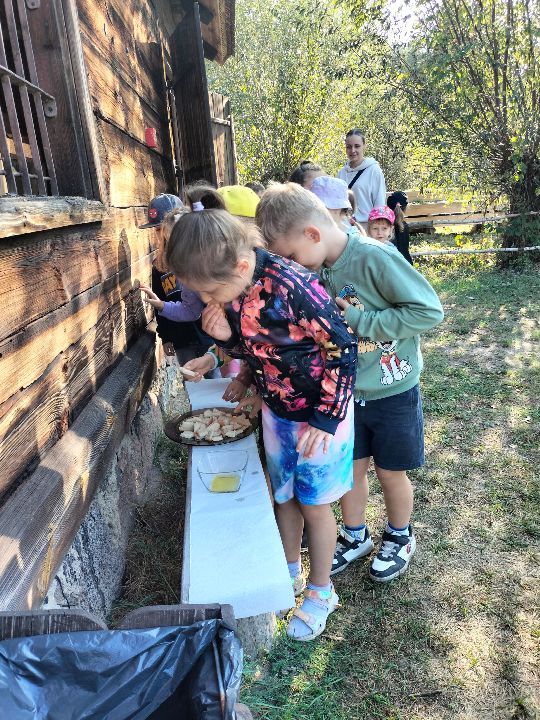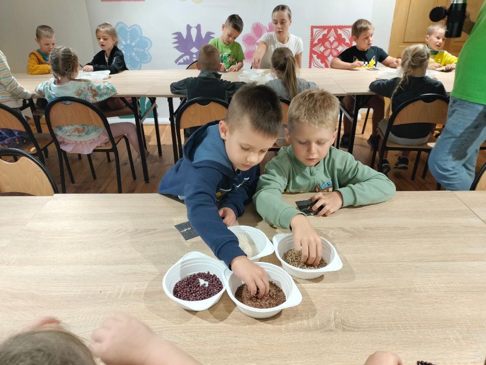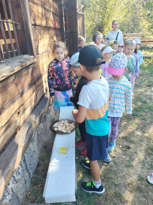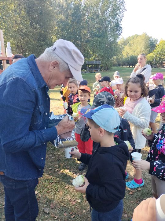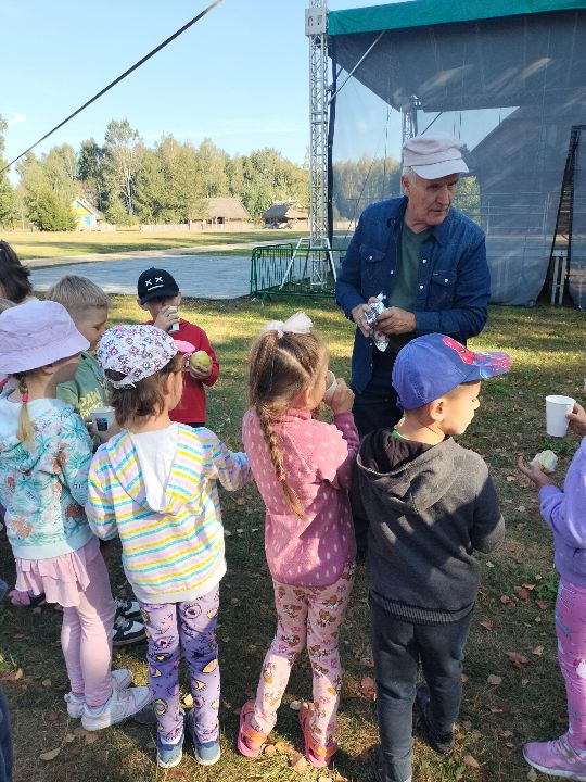 Dnia 23.09.2024 roku nasza grupa wspólnie z grupą V wybrała się na wycieczkę do Podlaskiego Muzeum Kultury Ludowej na warsztaty pt.: "Babie lato w skansenie". Na początku dzieci mogły zaobserwować jak dawniej wyglądał proces wyciskania soków owocowych i tłoczenia oleju. Oczywiście czekała na nas degustacja świeżo wyciśniętych specjałów. Następnie uczestniczyliśmy w audycji muzycznej "Nasze Podlasie" w dźwiękach jesieni, podczas której posłuchaliśmy znanych pieśni ludowych. Na koniec każdy przedszkolak wykonał obrazek z ziaren, który mógł zabrać na pamiątkę do domu. Wróciliśmy bardzo zadowoleni i uśmiechnięci.