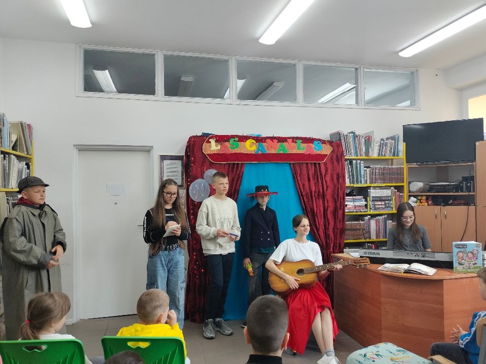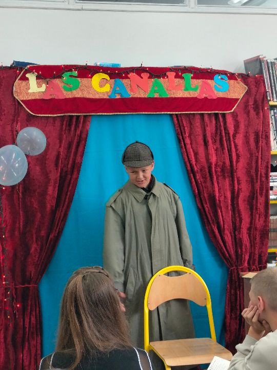 9 maja, tuż po śniadaniu, ponownie odwiedziliśmy bibliotekę w SP Nr 45. Kolejny raz obejrzeliśmy przedstawienie w wykonaniu uczniów klasy VI. Tym razem była to sztuka pt. "Las Canallas", w której przewijał się wątek detektywistyczny.
