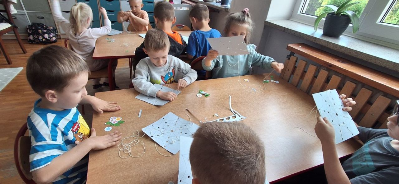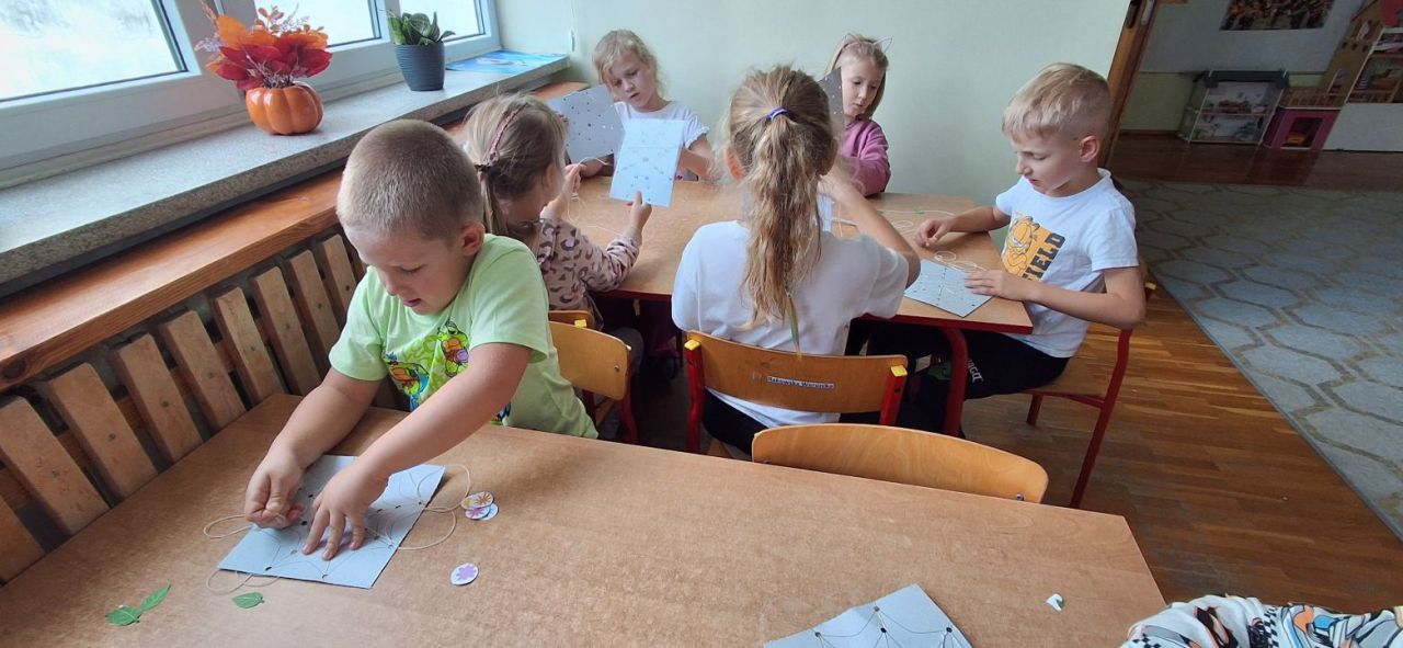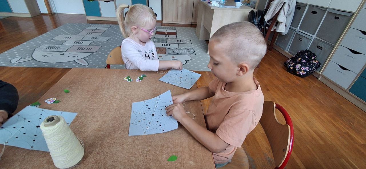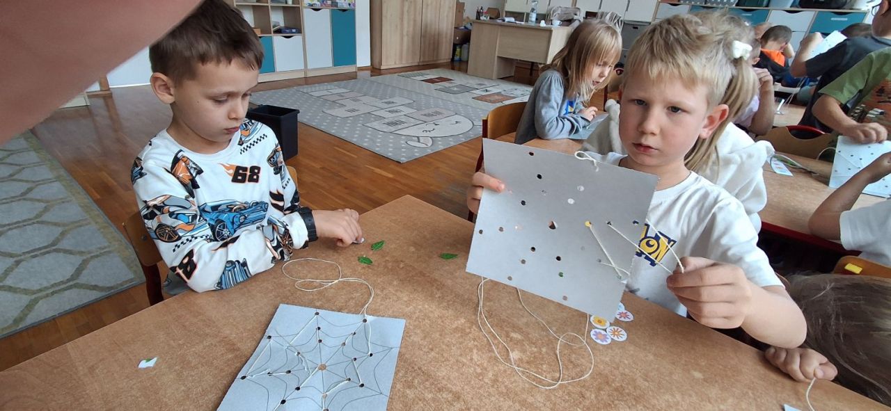 Jesień i babie lato zawitało również do grupy VI. Nasze przedszkolaki ćwiczyły ostatnio przewlekanie niteczek i stworzyły w ten sposób małe pajęczynki.