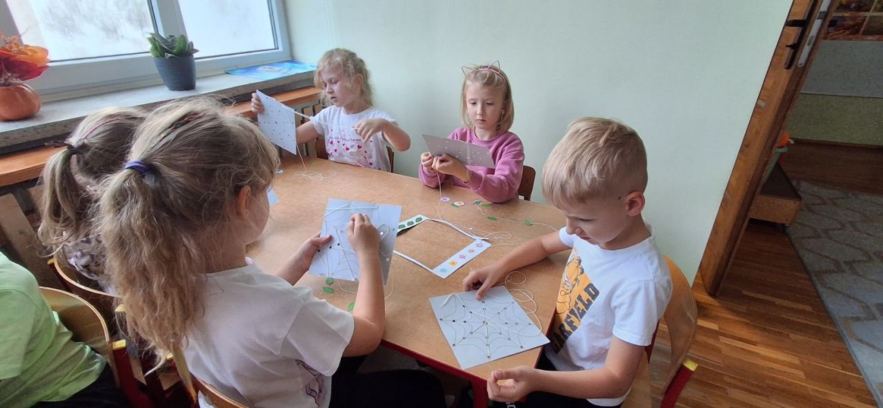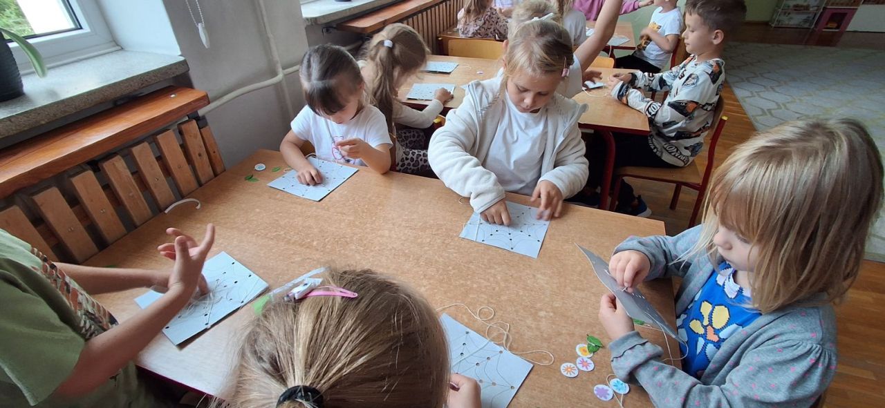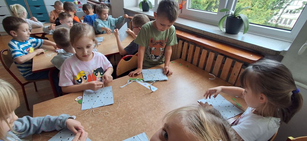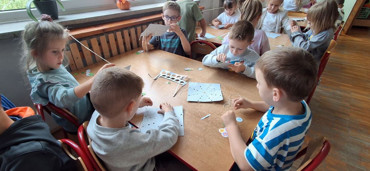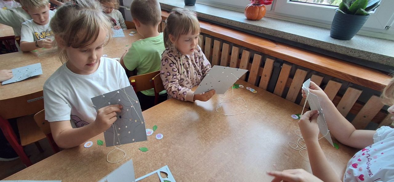 Jesień i babie lato zawitało również do grupy VI. Nasze przedszkolaki ćwiczyły ostatnio przewlekanie niteczek i stworzyły w ten sposób małe pajęczynki.