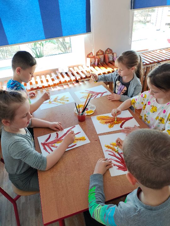 Dzieci miały okazję uczestniczyć w niezwykle ciekawych warsztatach pt. „Zabawy w przezroczyste” podczas których poznały nową technikę plastyczną. Zaproponowana praca przebiegała w kilku etapach. Najpierw dzieci naszkicowały ołówkiem krokusy, następnie odrysowały je markerem na płytce pleksi, żeby ostatecznie móc pokolorować je mazakami. Na tym nie koniec, bo żeby obrazek zachwycił wszystkich oglądających trzeba było wykonać tło, które powstało z kolorowych kartoników ozdobionych kółeczkami różnej wielkości. Efekt końcowy przeszedł najśmielsze oczekiwania. Dzieci podziwiały swoje prace i dzieliły się spostrzeżeniami. Każdy wyszedł z pracowni zadowolony i pełen zapału do dalszych artystycznych poszukiwań.