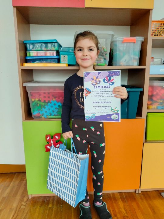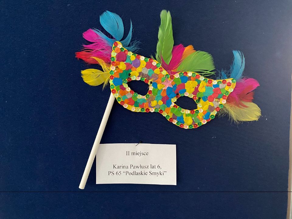 Z radością ogłaszamy, że Karina, wychowanka grupy VI, zajęła II miejsce w konkursie „Najpiękniejsza maska karnawałowa” zorganizowanym przez Przedszkole Samorządowe nr 79 "Konwaliowy Zakątek" w Białymstoku. Gratulujemy Karinie i życzymy dalszych sukcesów.