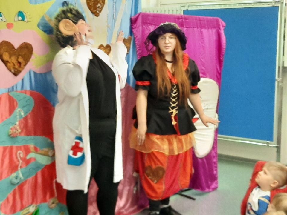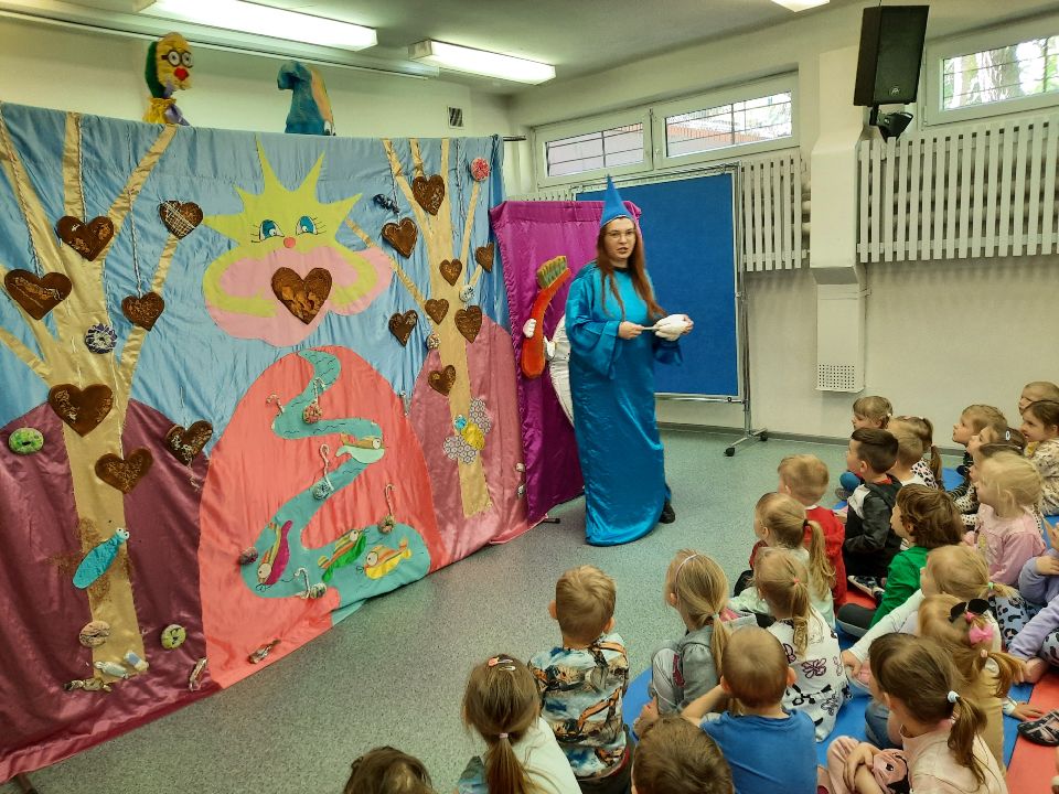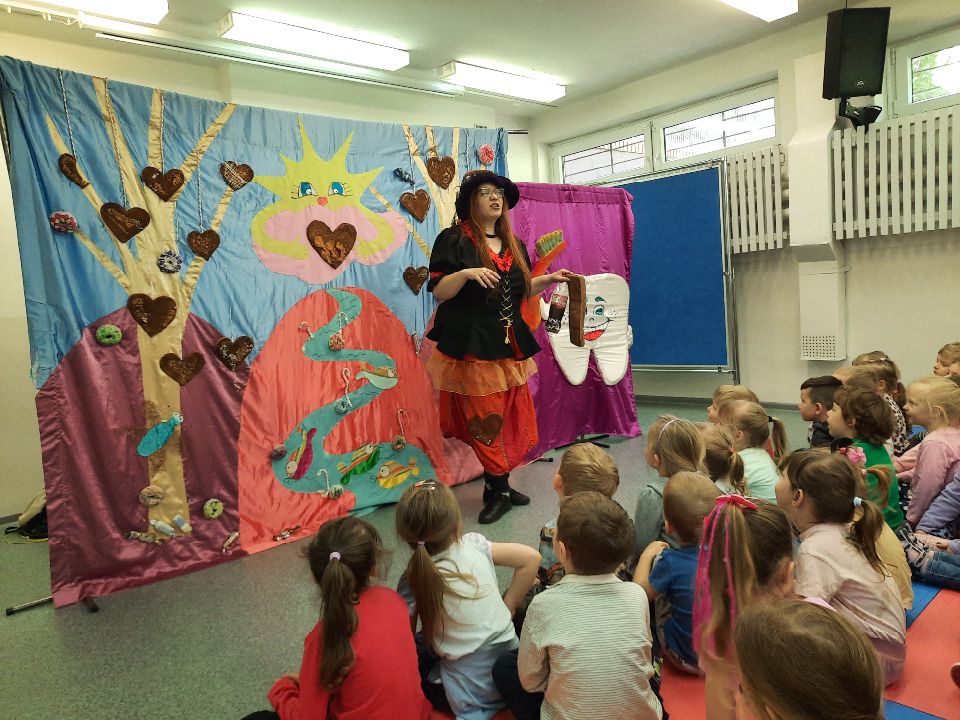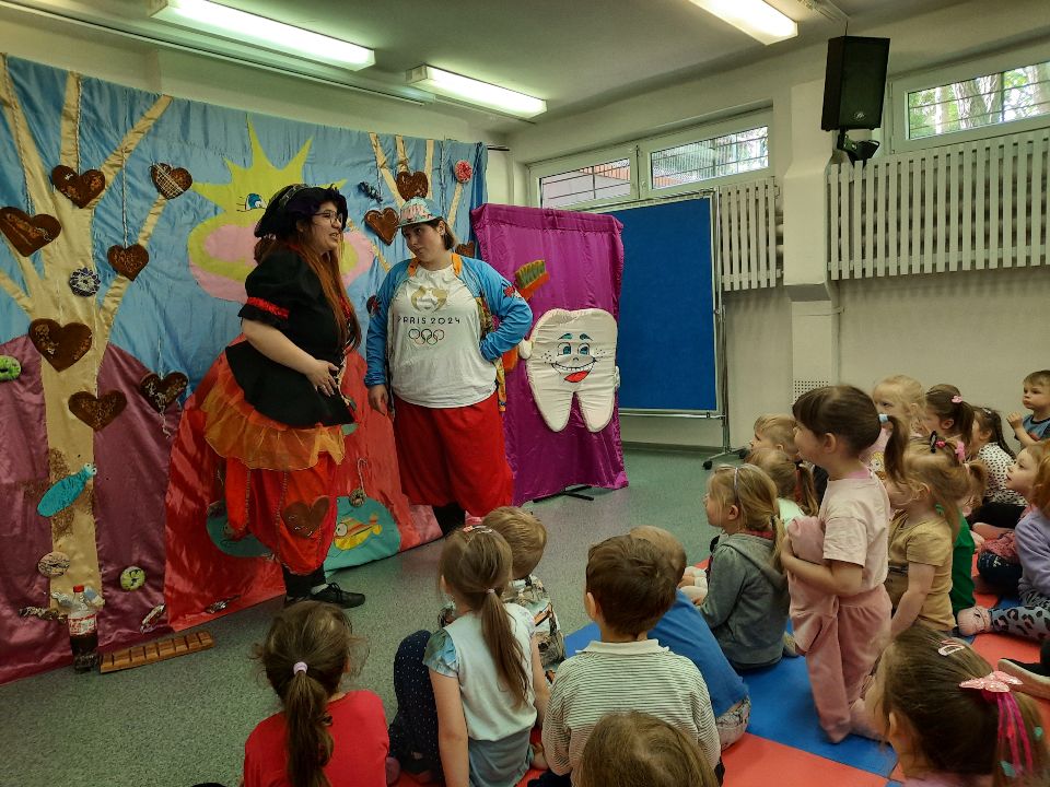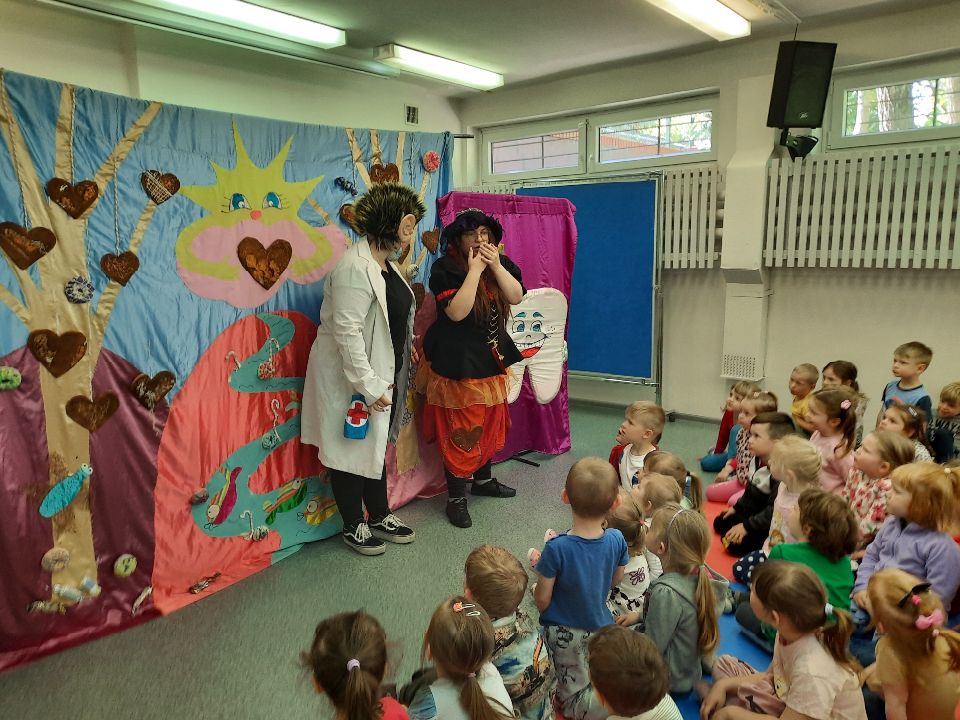 Dzisiaj w naszym przedszkolu gościliśmy Teatr Profilaktyczny ,,Magik" z Białegostoku. Główna bohaterka spektaklu- czarownica Próchnica w ogóle nie dbała o swoje zęby i zdrowie. Objadała się pizzą, hamburgerami i słodyczami, a wszystko to popijając colą. Mało tego- bała się chodzić do dentysty. Na szczęście złe nawyki pomógł jej wyeliminować doktor Czyściząbek. Pełen humoru spektakl pomógł naszym przedszkolakom przezwyciężyć strach przed wizytą u dentysty oraz promował zdrowy i sportowy tryb życia.smiley