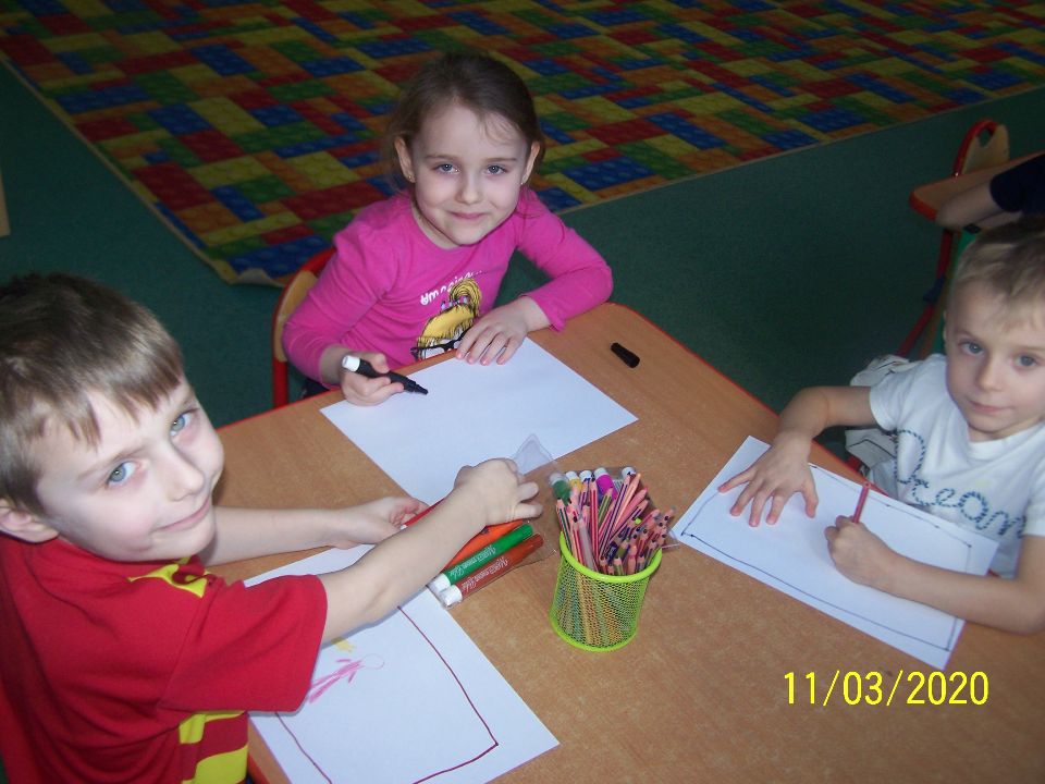 Piątek upłynął naszym przedszkolakom bardzo szybko i pracowicie. Na zajęciach matematycznych dzieci: liczyły, przeliczały, utrwalały zapis cyfr oraz znak matematyczny >, <. Odczytywały też ułożone przez siebie zapisy matematyczne. Później miały miejsce ćwiczenia gimnastyczne, które rozpoczęliśmy zbiórką. Były lubiane zabawy typu: „Murarz”, „Wiewiórki”, „Berek - czarodziej”, ćwiczenia metodą obwodu stacyjnego oraz bardzo lubiane zawody. Następnie był czas na relaks czyli ulubione zabawy dowolne, rysowanie i odpoczynek.