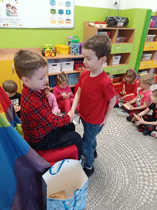 W dniu 13 lutego w naszej grupie świętowaliśmy Walentynki! 💌 Był to dzień pełen radości, uśmiechów i serdecznych gestów. Były piękne wyznania przyjaźni, miłe słowa oraz dużo wzruszających momentów💕Dzieci w tym dniu przyszły ubrane na czerwono i różowo, wprowadzając wszystkich w wyjątkowy, walentynkowy nastrój. Rozmawialiśmy o tym, czym jest przyjaźń, życzliwość i jak możemy okazywać innym sympatię na co dzień. Nie zabrakło „poczty walentynkowej” – dzieci obdarowywały się własnoręcznie przygotowanymi „walentynkami”❤️Niespodzianką dla wszystkich byly walentynkowe lezaczki z serduszkiem😍 A na koniec wykonaliśmy pamiątkowe zdjęcia!📷❤️