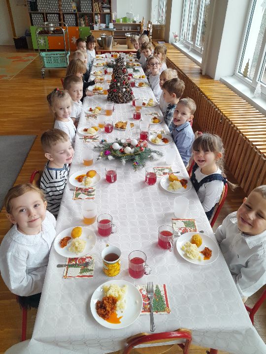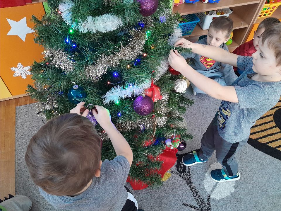 W piątek 15.12.2023r., gościliśmy w sali Rodziców naszych przedszkolaków. Okazją było przedświąteczne spotkanie, połączone z warsztatami. Na początku dzieci zaprezentowały poznane piosenki oraz taniec, a następnie wszyscy zasiedli do stolików, by wspólnie stworzyć świąteczne dekoracje, które ozdobią naszą salę i przedszkole.
