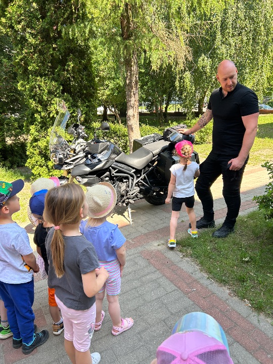 Wielką atrakcją i urozmaiceniem dnia w naszej grupie była wizyta Pana motocyklisty, czyli tatusia Marysi. Pan Grzegorz przyjechał do nas swoim sprzętem wraz z córką Julią, która jest jednocześnie absolwentką naszego przedszkola. Z przyjemnością podzielił się z nami swoją pasją i przypomniał podstawowe zasady ruchu drogowego. Nasi goście zaznaczyli również, iż bezpieczeństwo na drodze zależy nie tylko od znajomości i przestrzegania przepisów, ale także od odpowiednio dobranego stroju. Pan Grzegorz i Julcia mieli na sobie czarne, skórzane kurtki oraz kaski. Emocje wśród dzieci wzbudziła możliwość siedzenia na motocyklu oraz przymiarki kasku, w którym można było nawet posłuchać muzyki 🎶