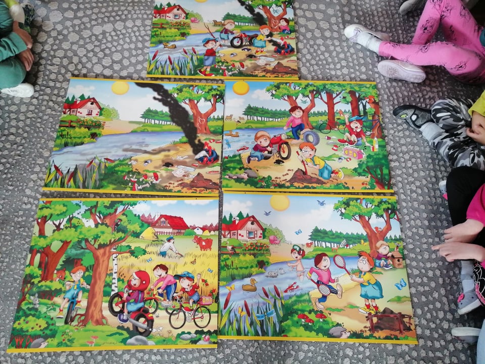W ramach Projektu „Segreguję nie marnuję!” przedszkolaki wykonały kolejne zadanie. Dziś dzieci układały i opowiadały historyjki obrazkowe, których celem jest wsparcie procesu wypracowywania postaw proekologicznych i utrwalających nawyki ekologiczne u dzieci. Przedszkolaki poznały sposoby na dbanie o środowisko w codziennych sytuacjach min.: jak powstają zanieczyszczenia powietrza oraz rzek, jak należy zachowywać się w lesie, jak codziennie ograniczać użycie plastiku oraz jak poprawnie segregować odpady. Już bardzo dużo wiemy, a to jeszcze nie koniec udziału w projekcie