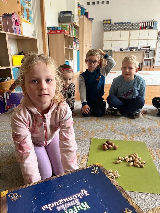 Na dzisiejszych zajęciach dzieci poznały produkty, które bardzo lubi jeść wiewiórka. Badały właściwości różnego rodzaju orzechów - włoskich, ziemnych i pistacjowych. Opisywały ich kształt, kolor, wielkość, strukturę. Za pomocą dziadka do orzechów rozłupywały orzechy, badały zawartość skorupek, jak również je smakowały. Dzieci dowiedziały się jak bardzo dużo cennych składników odżywczych posiadają przysmaki wiewiórki i jaki mają wpływ na prawidłowe funkcjonowanie organizmu.
