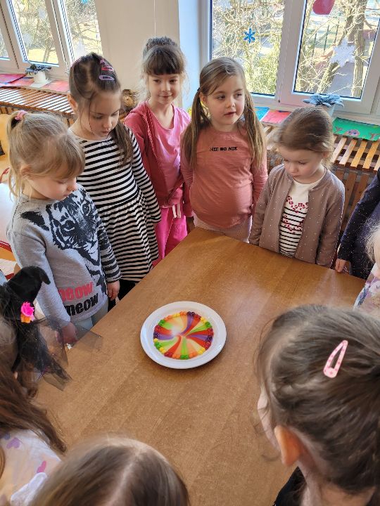 Jak powstaje tęcza cukierkowa? Takie doświadczenie przeprowadzili dzieci z grupy IV. Najpierw trzeba poukładać cukierki, następnie wlać trochę wody i czekać na efekty