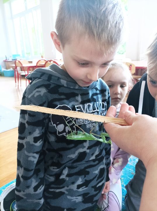 W tym tygodniu uczymy się o łące - o roślinach, które na niej rosną, małych zwierzętach i owadach, które na niej żyją. W dniu dzisiejszym naszą grupę odwiedziła modliszka Mania. Pani Natalia opowiedziała wiele ciekawostek na temat życia tego owada. Było to dla nas wielką niespodzianką, bo takiego owada nie spotykamy na co dzień.