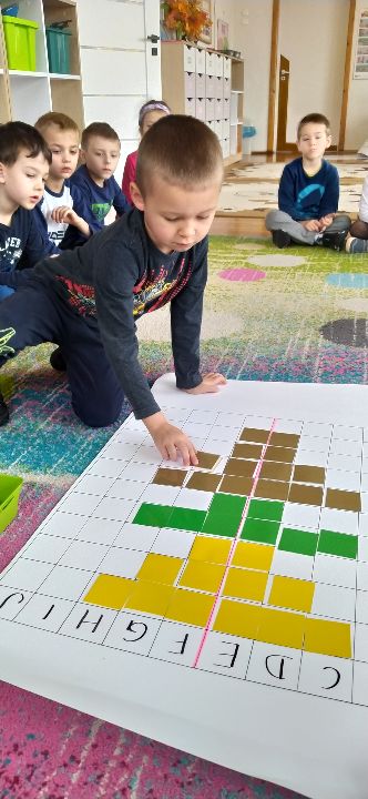 Kodowanie to połączenie zabawy ze zdobywaniem umiejętności programistycznych. Rozwija ono podstawowe funkcje poznawcze takie jak: pamięć, koncentracja uwagi, analiza, synteza wzrokowa i słuchowa oraz koordynacja ruchowa. W ramach projektu „Inkubator edukacji – edukacja matematyczna” bawiliśmy się w kodowanie na dywanie. Wykorzystywaliśmy do tego planszę oznakowaną cyframi i literami oraz materiał przyrodniczy: szyszki, kasztany i żołędzie.