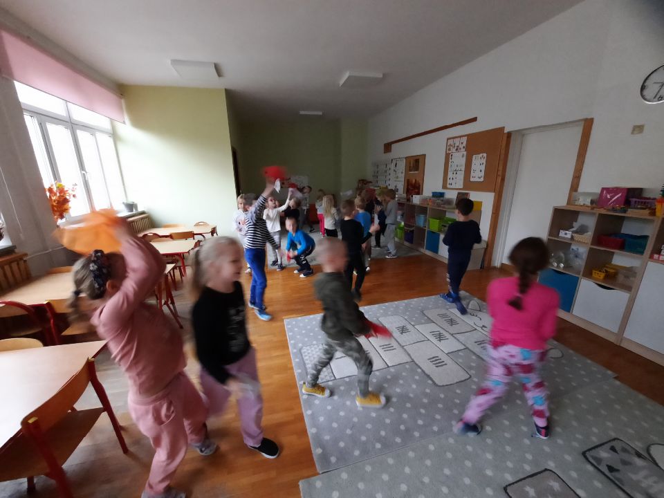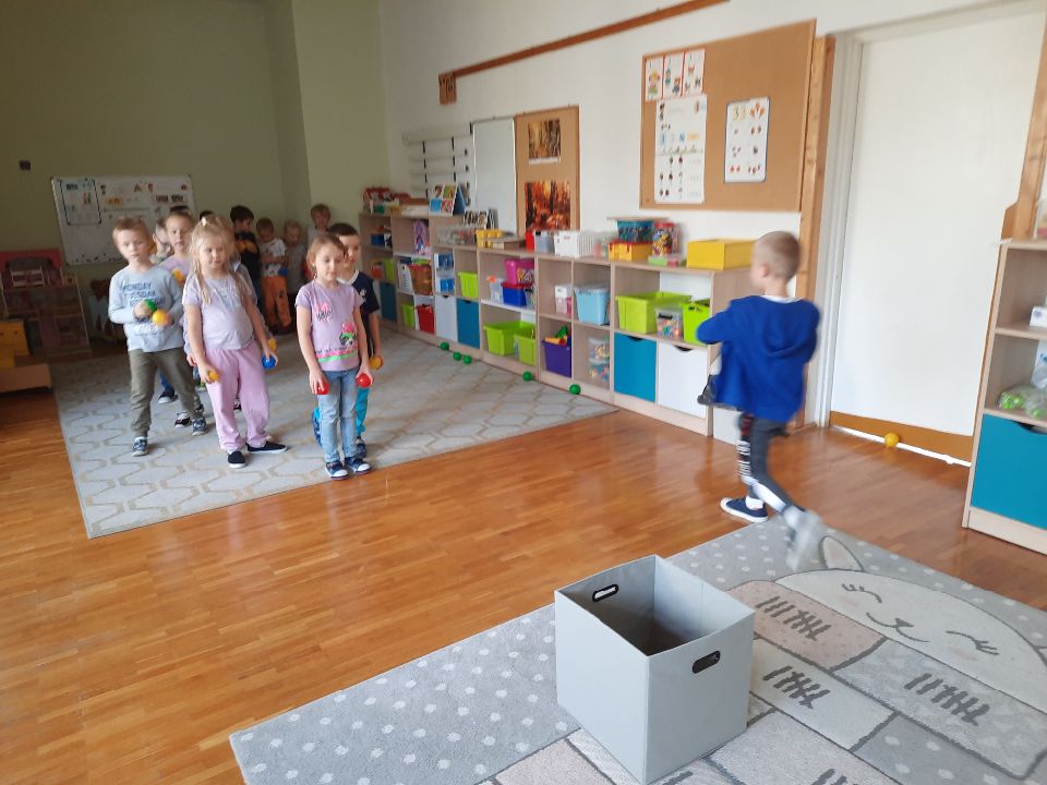 Chusta animacyjna to przyrząd do ćwiczeń tak ciała jak i ducha, a na dodatek bardzo lubiany przez dzieci. W tej zabawie dodatkowo z piłeczkami czyli zapasami wiewiórki, które wpaść miały do dziupli - otworu znajdującego się na środku chusty. Oczywiście najfajniej było jak zwykle pod chustą- śmiechu było co nie miara.😅 Zakończyliśmy naszą zabawę celowaniem piłkami do pudełka. Wszystkie trafone😉