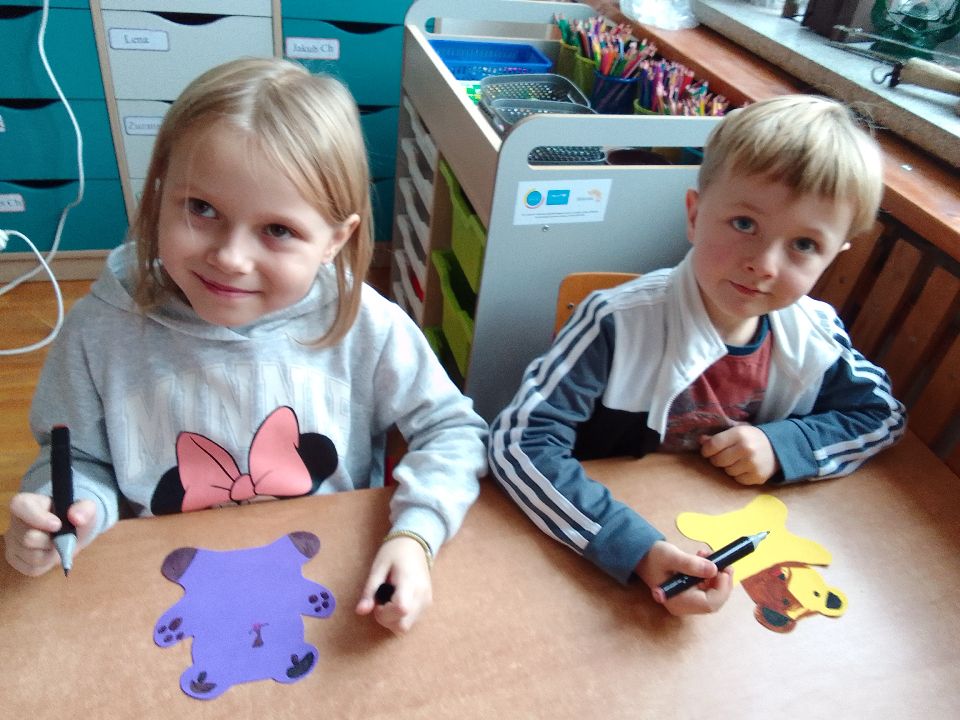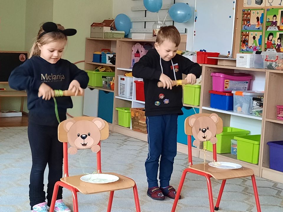 Dzień pluszowego misia nie skończył się w naszej grupie na rannych zabawach. Po obiedzie bawiliśmy się dalej. Przypomnieliśmy sobie misiowych bohaterów dawnych dobranocek i ułożyliśmy napis „ miś”. Przedstawiliśmy pani nasze misie, a potem już tylko zabawa. Nakarmiliśmy misie sznurkowym spaghetti i ścigaliśmy się w jak najszybszym zdobyciu słoika z miodem. To był bardzo udany dzień.