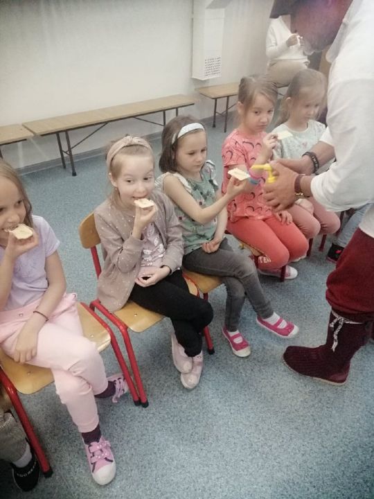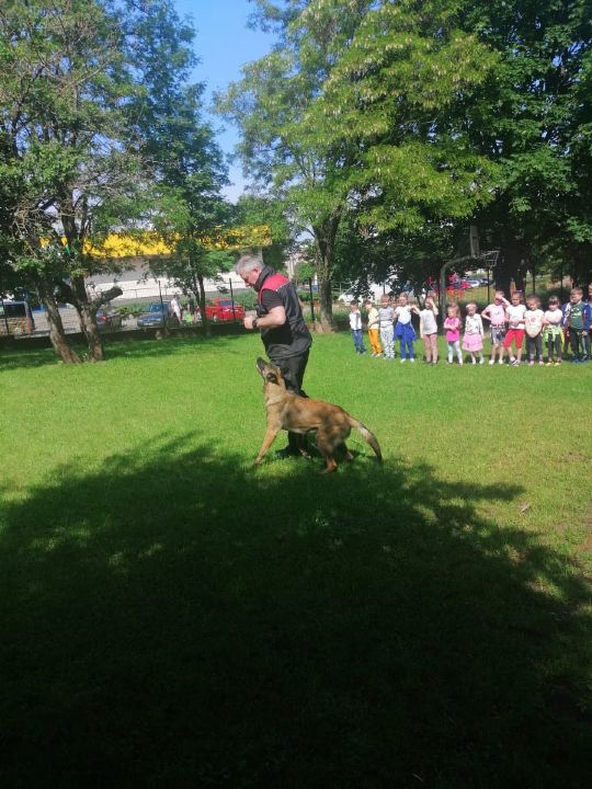 W poniedziałek 06.06.2022r. dzieci z naszej grupy miały okazję uczestniczyć w spotkaniu z pracownikiem Straży Miejskiej, panem Jarosławem oraz jego psem Kold. Podczas tego spotkania przedszkolaki utrwaliły swoje wiadomości dotyczące właściwego postępowania w przypadku kontaktu z nieznajomym psem. Na koniec mogły podziwiać sztuczki jakie zaprezentował pies na komendę swego pana.