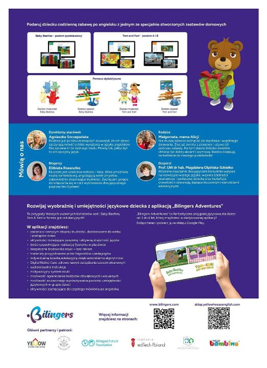 Przedszkolaki w wieku 3-5 lat będą realizować w przedszkolu Program Powszechnej Edukacji Dwujęzycznej ,,Bilingers'' (w ubiegłym roku ,,Bilingual Future''). Jego zasadniczym celem jest codzienne, kontekstowe osłuchiwanie dzieci z językiem angielskim w okresie szczególnej wrażliwości językowej tak, żeby angielski nigdy nie stał się dla nich językiem obcym. W ten sposób właśnie dziecko naturalnie – czyli na tych samych zasadach jak pierwszy – nabywa drugi język. Każdego dnia dzieci osłuchują się z językiem angielskim - poprzez film, piosenkę, zadanie w książce, zabawy dydaktyczne i ruchowe z piosenkami. Rodzice dzieci z grup objętych programem dostaną od nauczycielek kody do platformy internetowej, na której będą mogli razem z dzieckiem również osłuchiwać się z językiem angielskim i rozwiązywać zadania. Każde dziecko w wieku 3-5 lat będzie miało swoją książkę z zadaniami, które będzie rozwiązywać w swojej grupie przedszkolnej:
